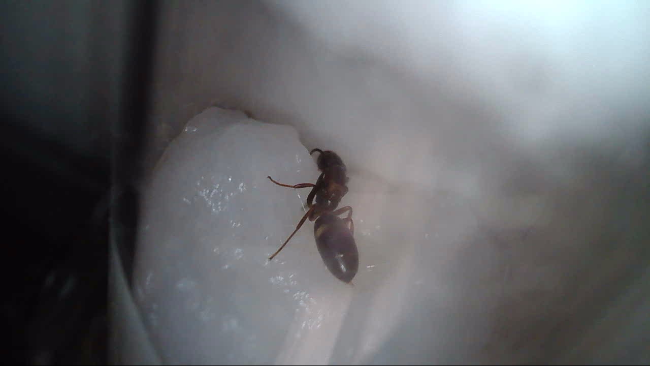 Auf den Fotos etwas schwer zu erkennen: Kopf und Thorax sind kastanienbraun, der Gaster ist schwarz mit einem recht breiten Weißen Streifen nach dem ersten Segment.