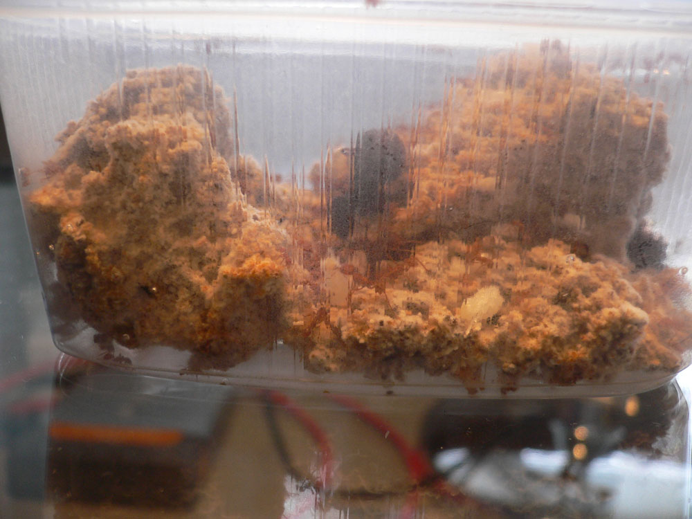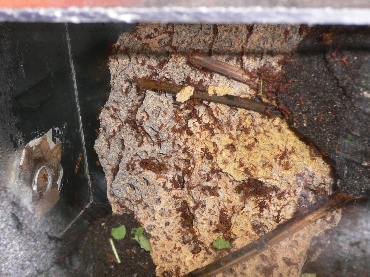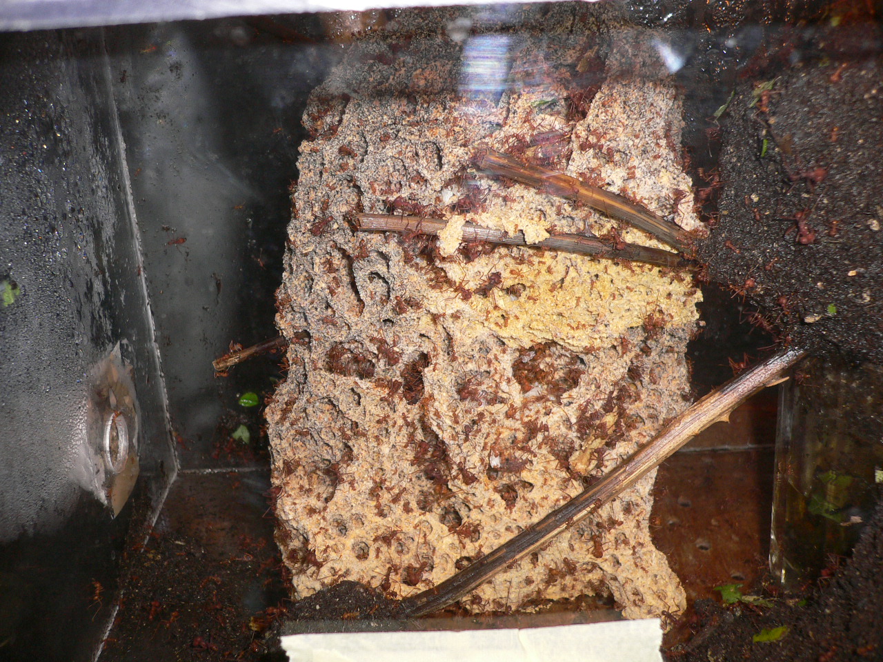 Als Meine Atta sexdens Kolonie ist inzwischen gewalltig gewachsen und sie haben einen Neuen Pilz in der Futtekammer heran gezogen, dieser ist inzwischen doch schon beinahe Fussball gross und die Gyne ist auf ihn gezogen, sodas ich sie gut sehen und beobachten kann.