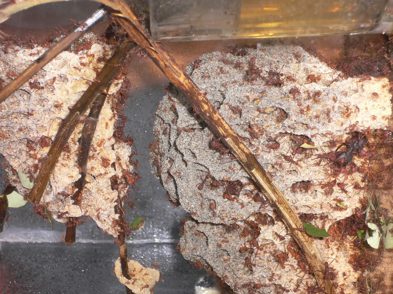 Inzwischen ist meine Atta sexdens Kolonie auf gewaltig gewachsen d.h. der Pilz füllt berits mehr als das halbe Pilzbeken aus. Ich hab nun begonnen wieder vermehrt Brombeeräste zu füttern und konnte beobachten, dass der Pilz rasant schneller gewachsen ist, daraus schliesse ich, dass Brombeer Blätter, nebst Rosenblättern und den lättern, welche die Tiere auch in der Natur schneiden (Südamerika) die am besten geeigneten Blätter sind für den Pilz. Wicht scheint mir aber, dass man nicht immer das selbe füttert, sonden abwechselt. Hafer- resp. Hirseflocken eignen sich auch herforragend, dann wächst der Pilz aber mehr etwas Schwammartig und die Kammern werden nicht so gross gestaltet.