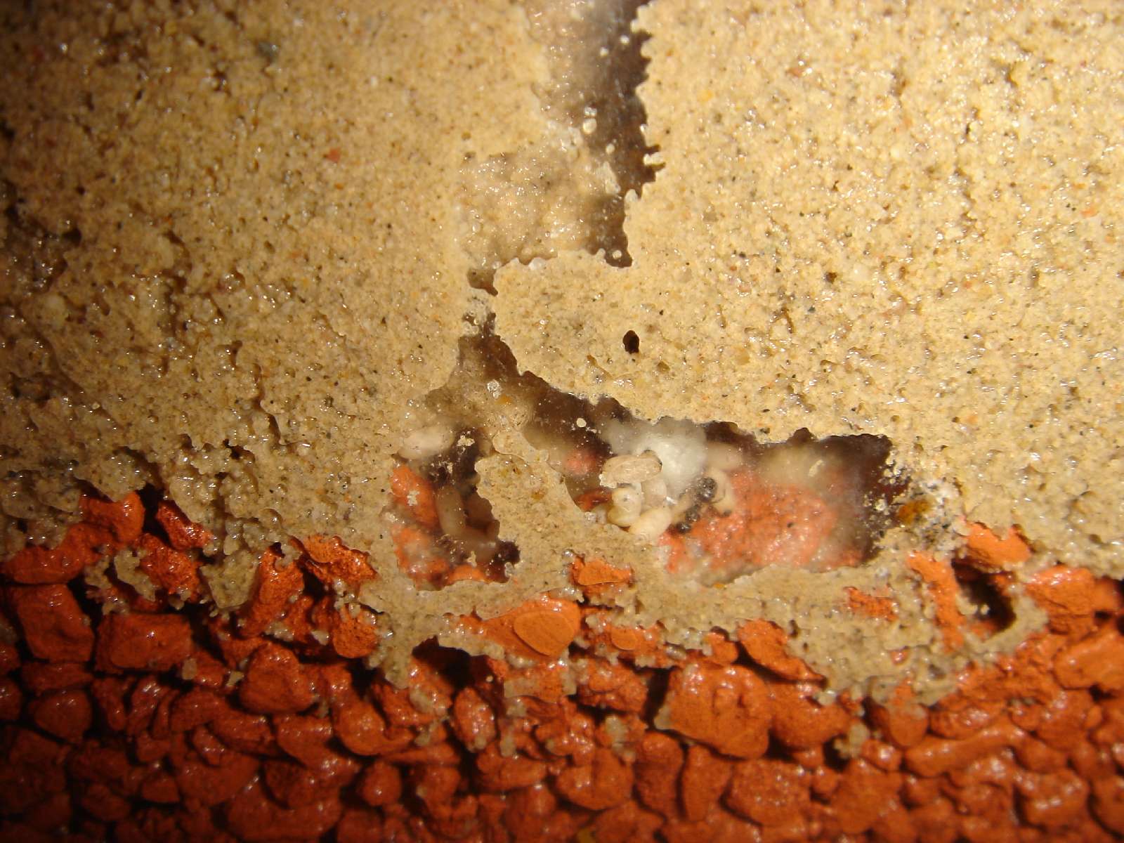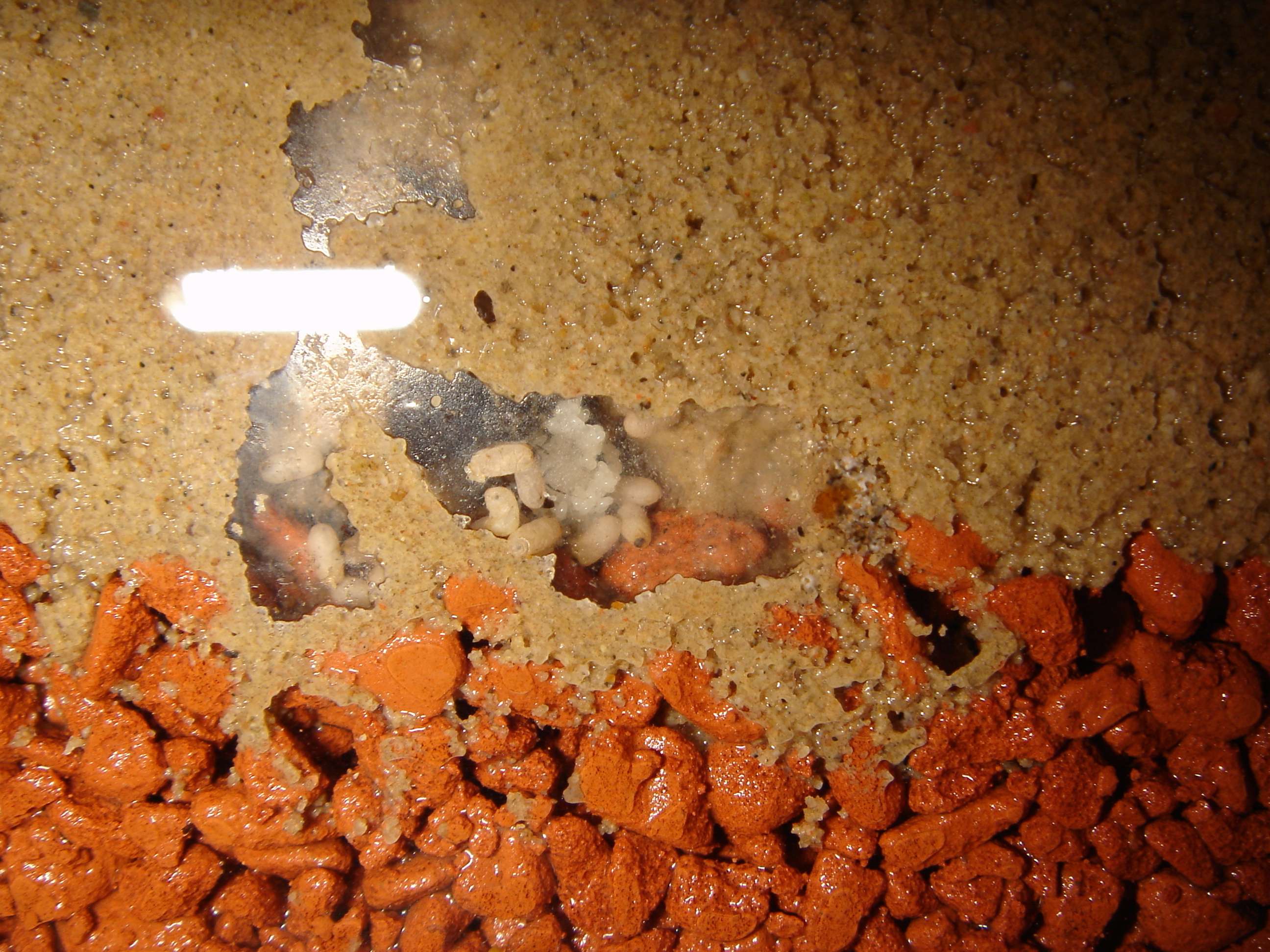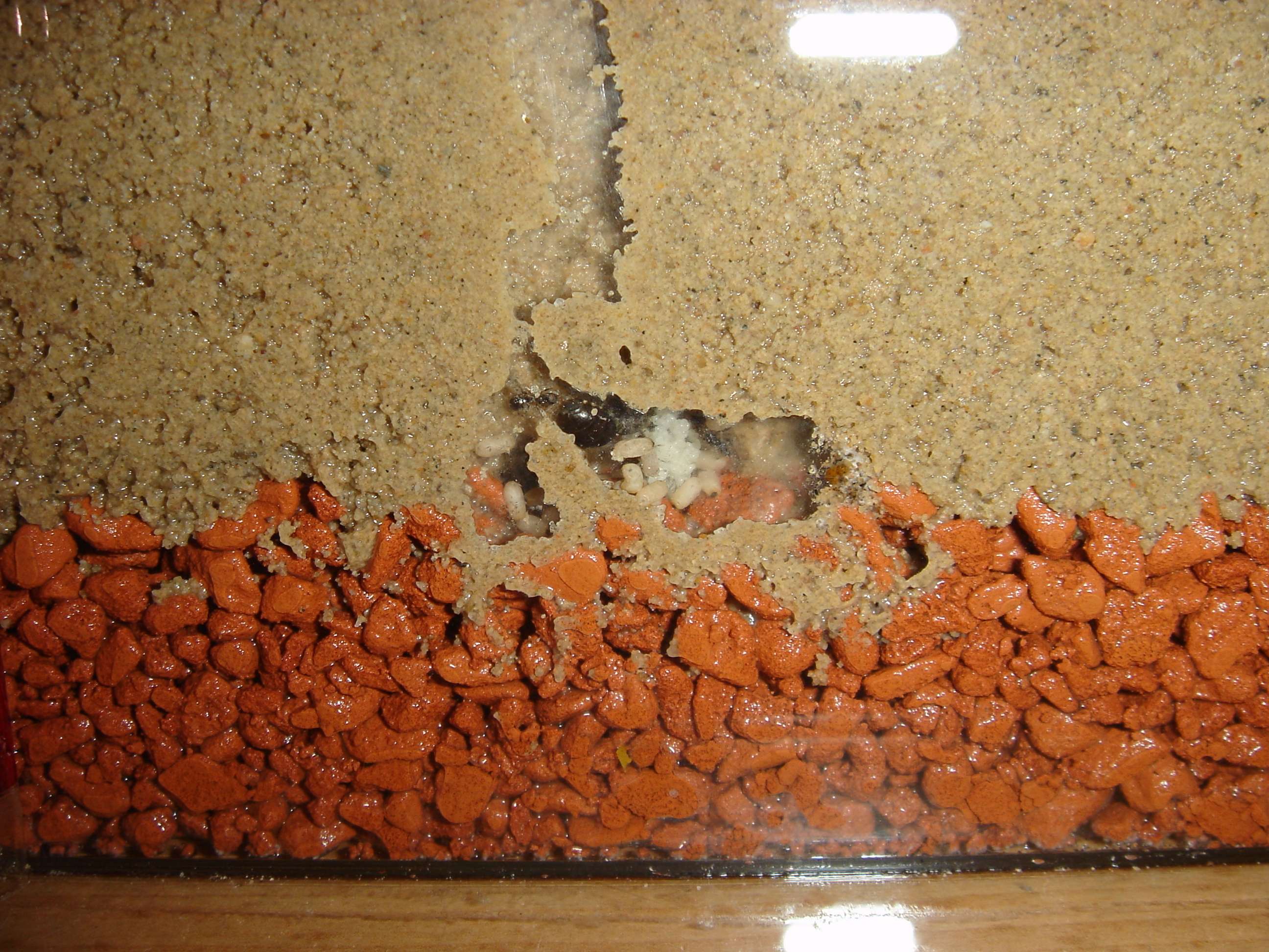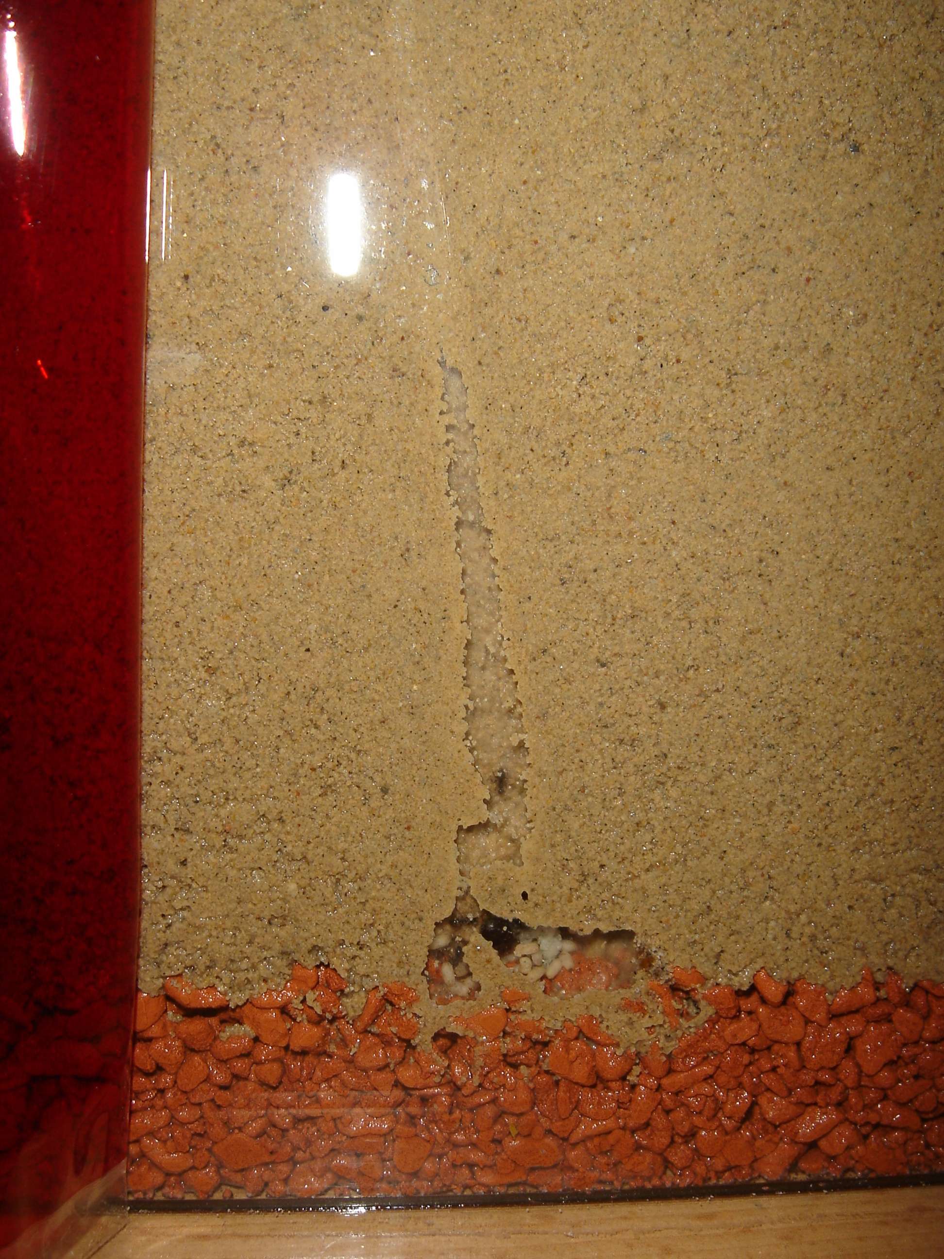 wow dein becken ist aber feucht... ich habe immer nur ca. 2 ml wasser in der früh und am abend oben drauf gegeben. nun ist der sand bis unten dünkler geworden und nun befeuchte ich über das rohr. ameisen sind ja noch ned eingezogen^^