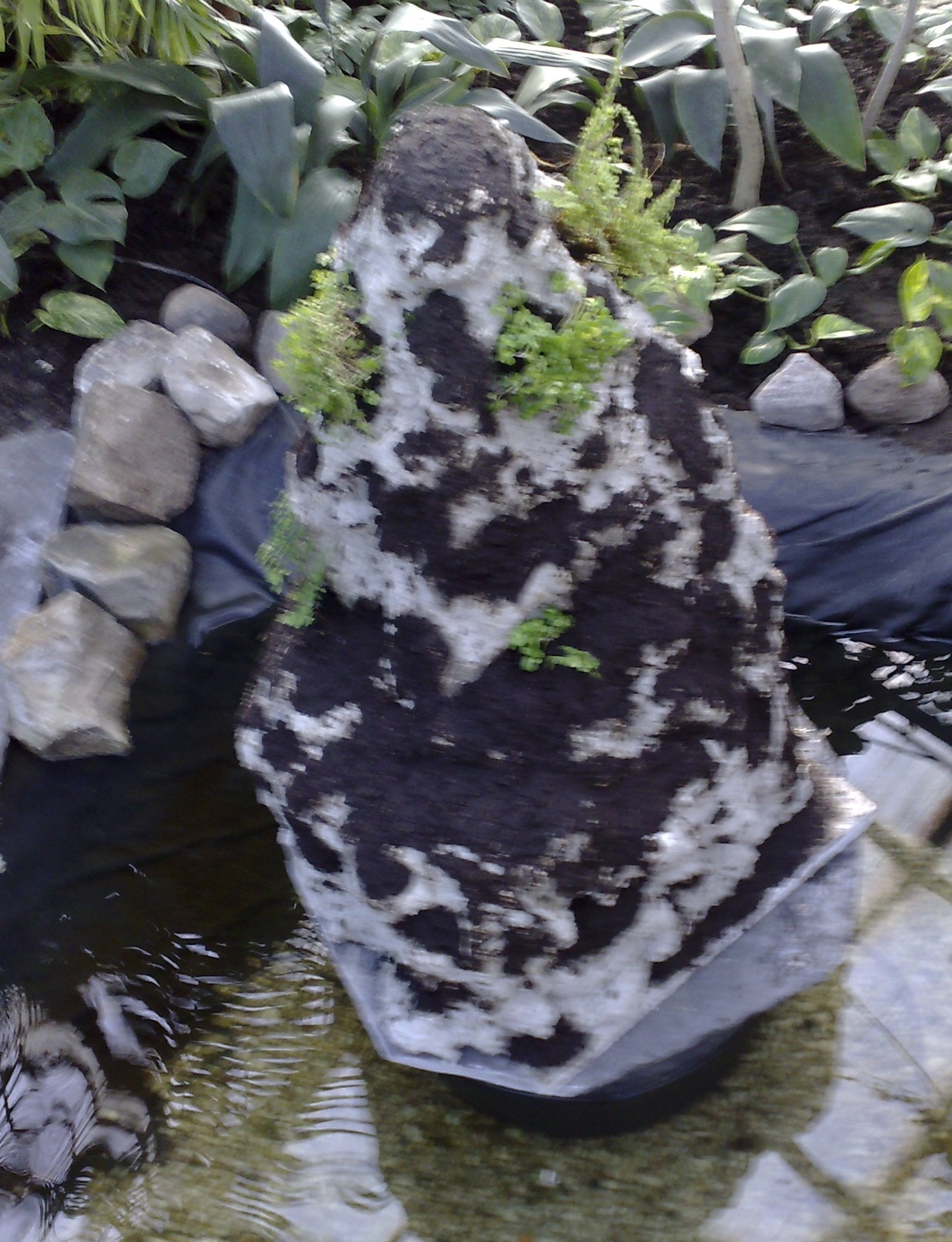 Es wurden Pflanzen eingepflanzt und Teile des Felsens mit Humuserde überzogen, damit sich Moose dadrauf bilden können.