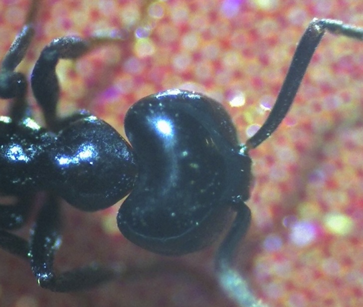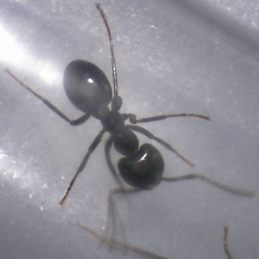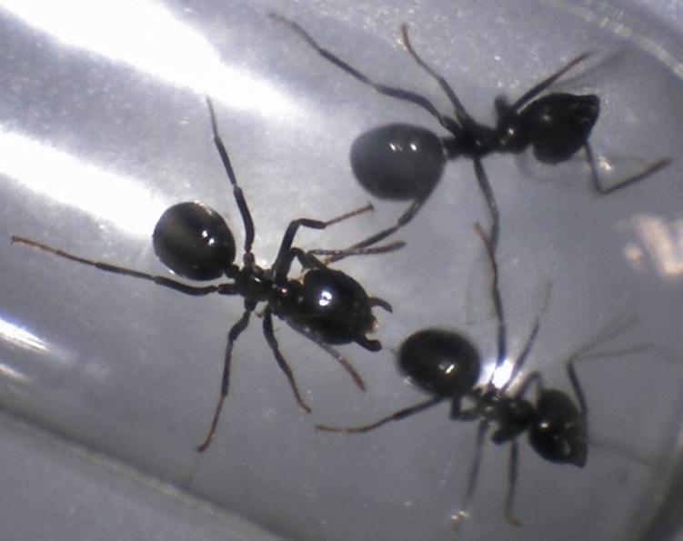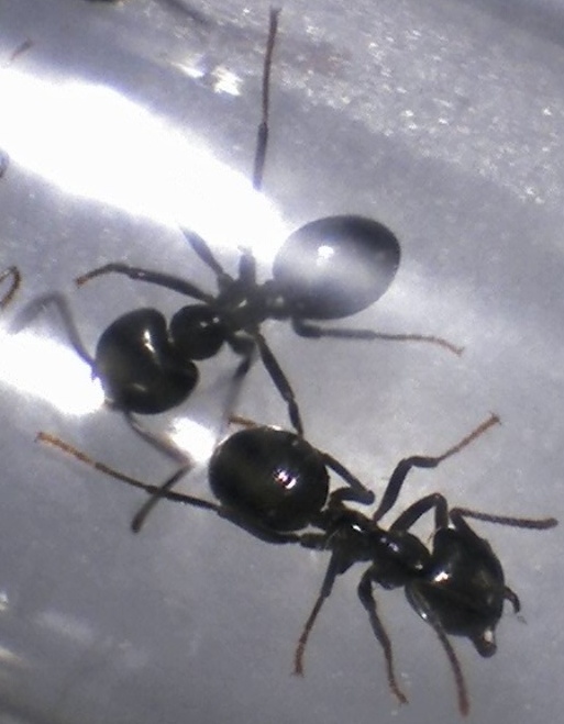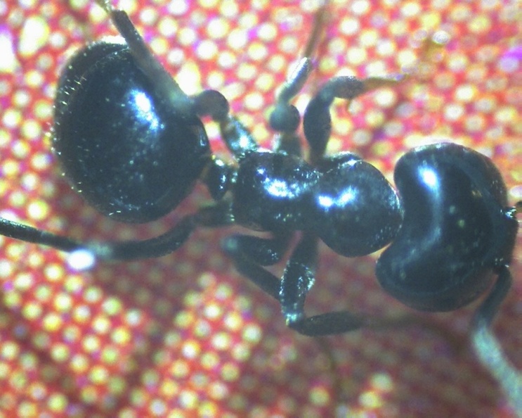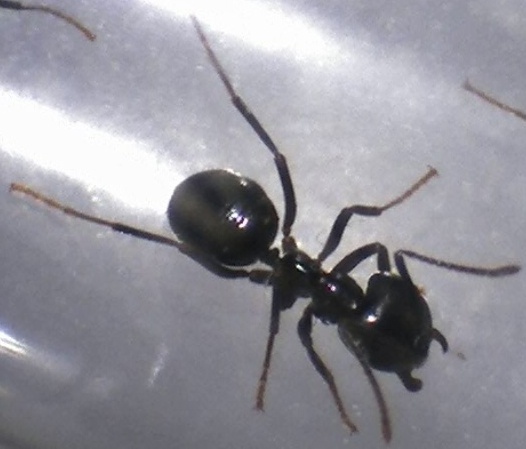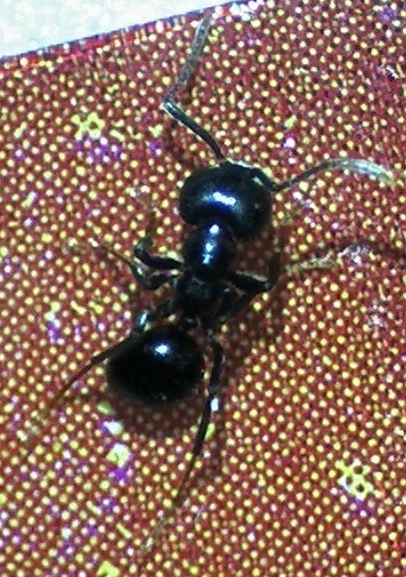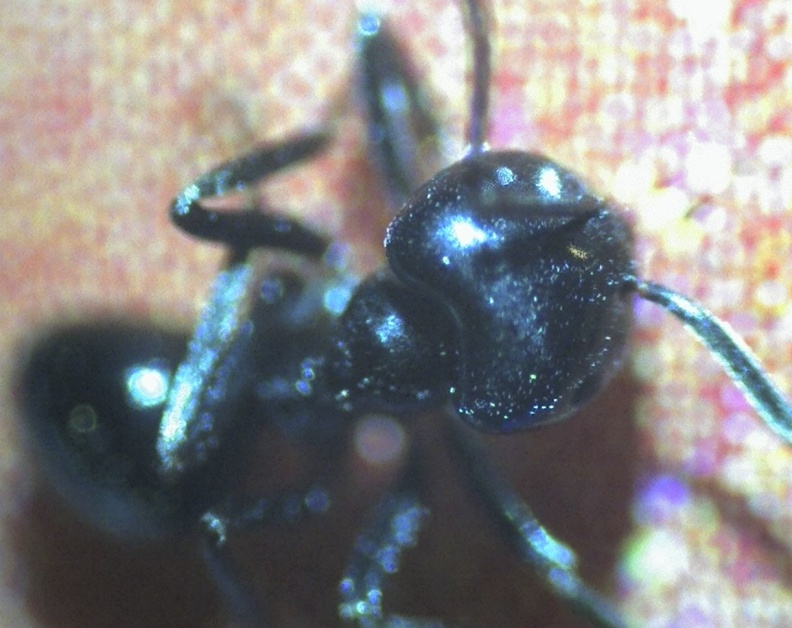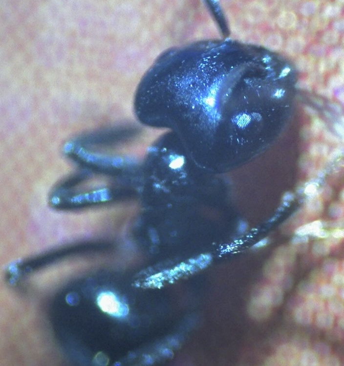 Sonst sind dort viele Formicas, auch einige Lasius' und Myrmicas sind dort zu sehen, stattdessen liefen dort auf den ersten Blick seltsam dickschädelige Arbeiterinnen herum, pechschwarz und glänzend, sie besetzten den ganzen stark begrühnten Mittelstreifen dieses Feldweges und die linke, Waldseite für etwa drei bis fünf Meter, auf der rechten Seite, die der Wiese zugewandte Seite, waren dagegen nur wenige zu sehen und sie waren auch nicht so aggressiv, wenn man Sandalen trägt, macht das schon einen Unterschied aus!