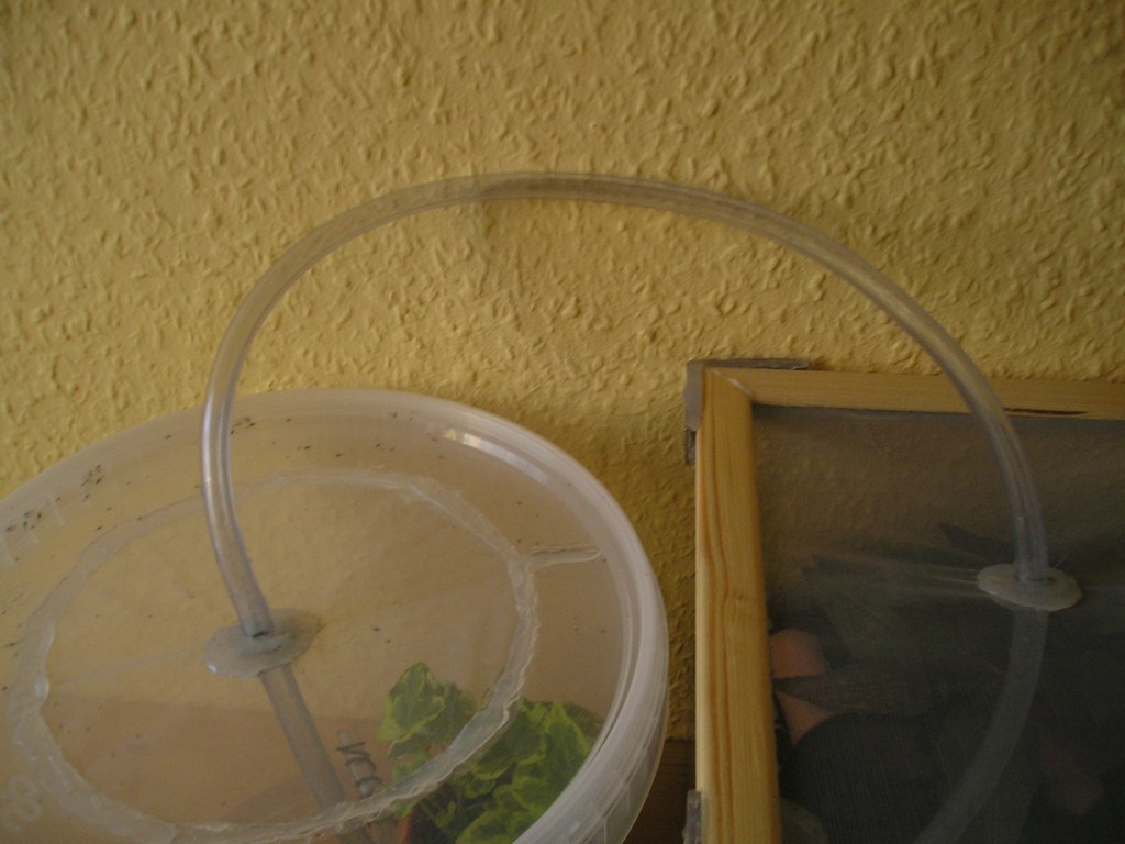 Den Rand des Aquariums habe ich mit Fensterisolierpolsterband von Tesa umklebt und die og´bere Kante mit Tesafilm abgedichtet. Dann habe ich mir im Baumarkt vier Leisten auf die entsprechende Kantenlänge zusägen lassen und das ganze mit einer Heißklebepistole und solchen Schraubwinkeln zusammengeklebt (Sie selbst ist die Frau!) Habe dann Ameisenfliegengitter aus dem Shop als Decke angeklebt und einen Plastikschlauch durchgestochen. Um das ganze zu stabilisieren habe ich solche Metallplatten festgeklebt, die man sonst zwischen Schraube und Holz macht. Als Arena habe ich einen 5kg Eimer für Nagerfutter genommen, ein Loch in den Deckel geschnitten und das ganze wieder mit Ameisengitter und Schlauch und Metallring/platte verklebt.