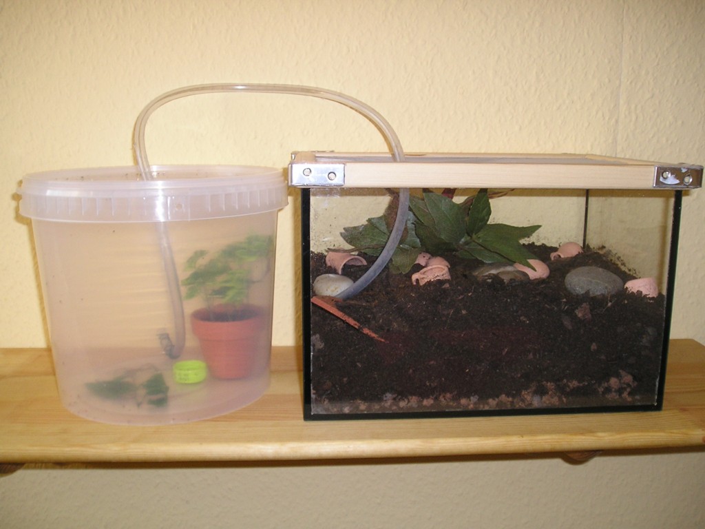 Nun zu meinem Hauptvolk: Ich habe ein altes Miniaquarium am Boden mit Tongranulat bedeckt und darüber eine dicke Schicht Blumenerde und Torf geschichtet. Das ganze habe ich natürlich vorher im Ofen abge....backen?!