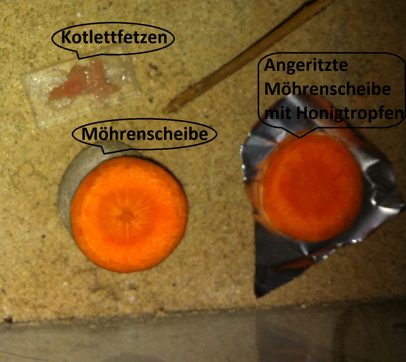 Heute gabs mal wieder ne neue frische abgebrühte Made, und als Test eine unabgebrühte. Mal schauen wo sie sich drauf stürzen. Oder ob sie beides ignorieren.