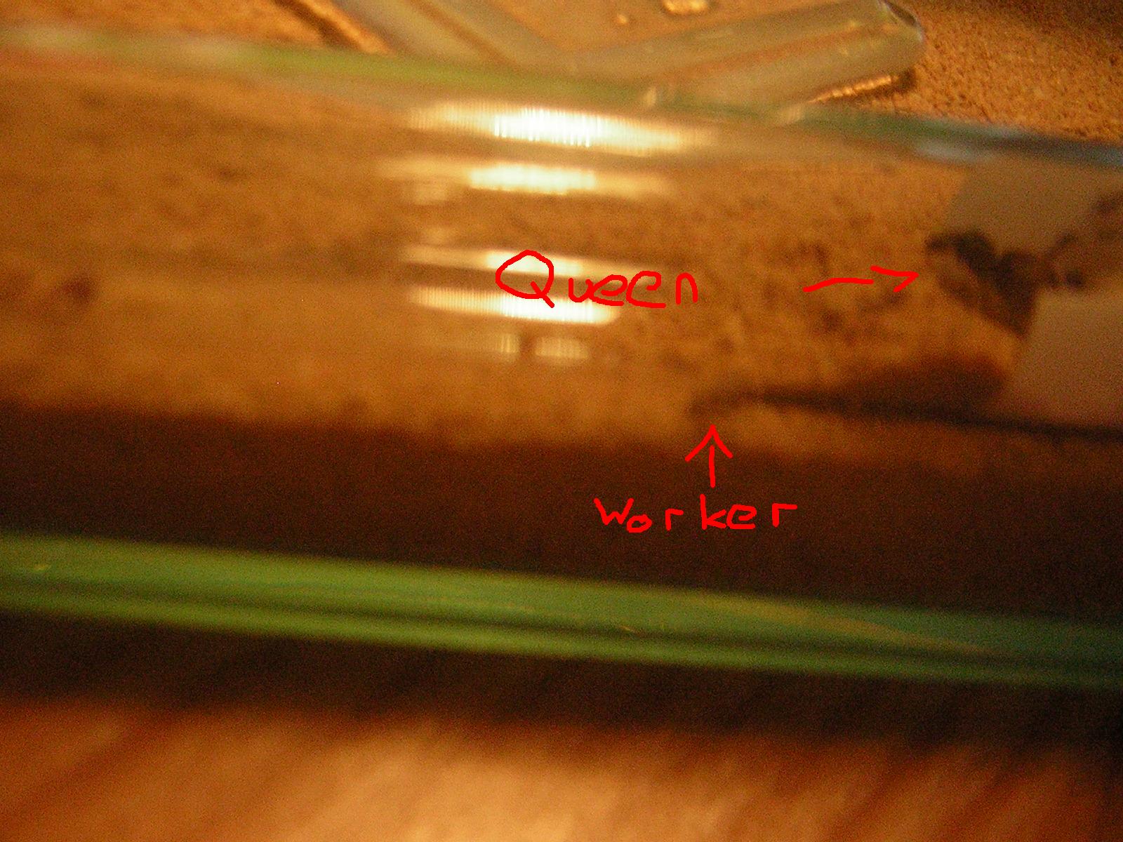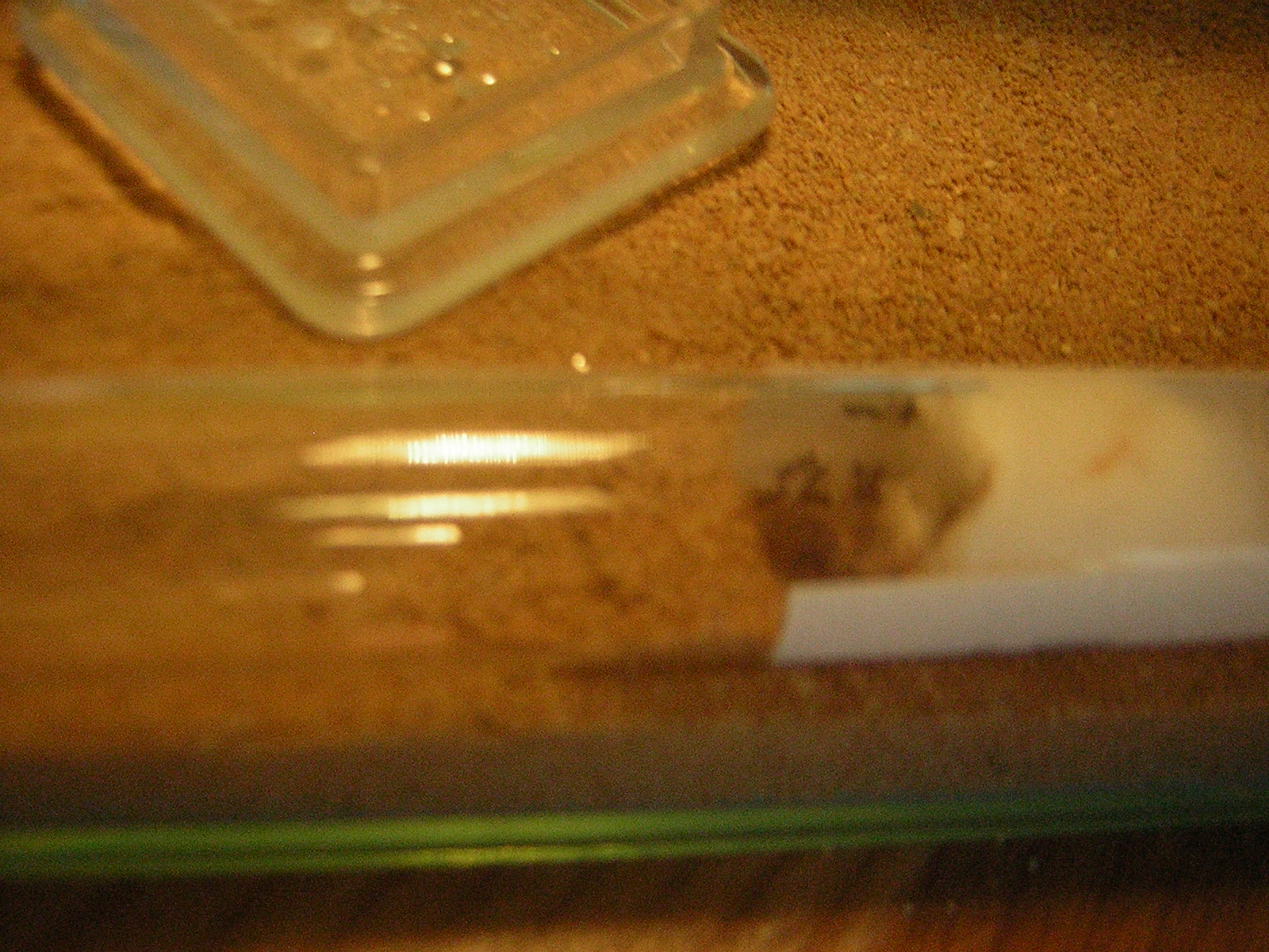 Ein riesen teil der Kolonie ist über der Winterruhe gestorben und dann haben auch noch die Fliegenbeine im Nest angefangen zu schmimmeln.Mir war sofot klar was ich machen sollte ich habe eine 10Watt Lampe an der Farm gehalten. Nach kurtzer zeit habe ich dann auch die noch lebende Königin gesehen sie suchte den schnellsten weg nach oben und die noch lebenden Arbeiterinnen folgten ihr als sie dann das abgedunkelte Reagenzglas fanden dauerte es nicht lange und die Kolonie war drin.