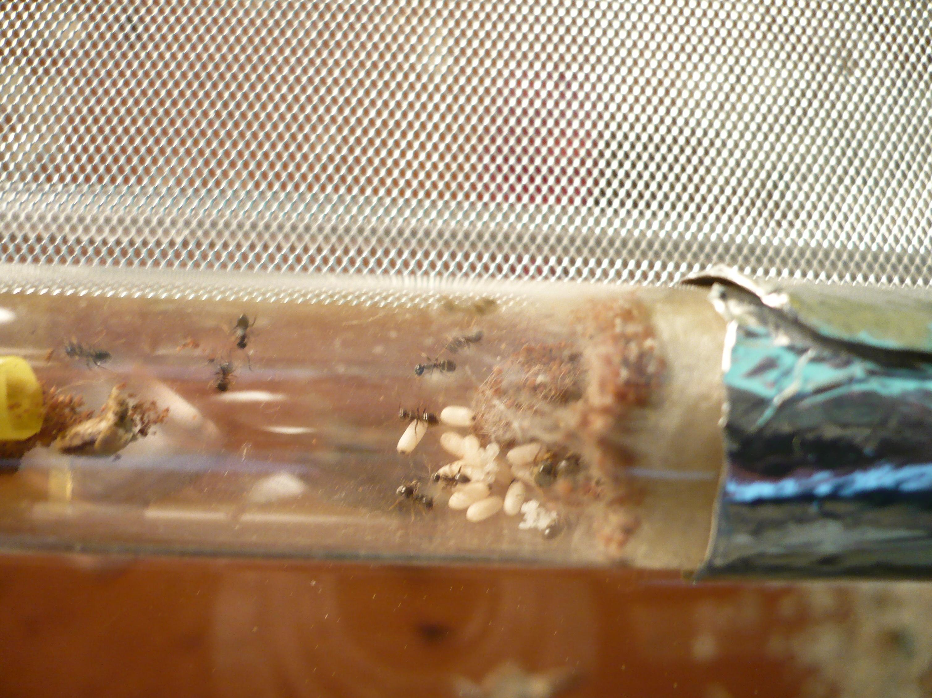 Als ich das Reagenzglas geschlossen in eine Schublade gelegt habe konnten sie sich wieder von den ganzen strapazen erholen. Auserdem haben sie noch eine Larve mitgenomen. Ich habe sie dann eine Woche n ruhe gelassen in dieser Zeit hat die Königin neue Eier gelegt es ist ein kleiner Haufen aber immerhin etwas.