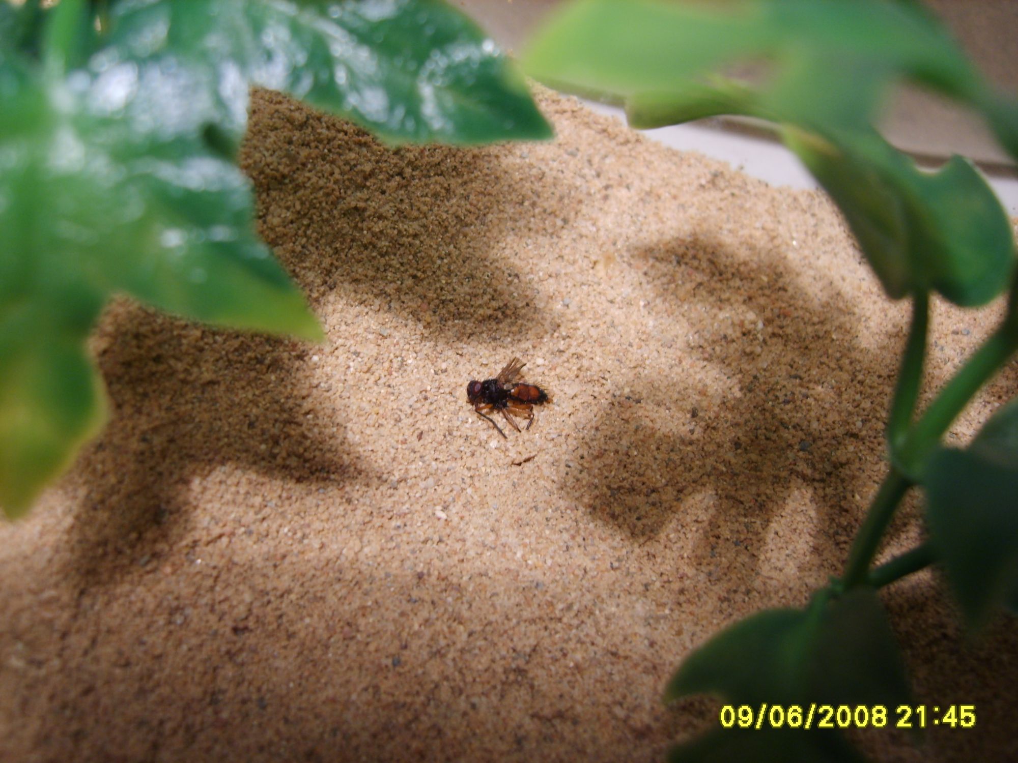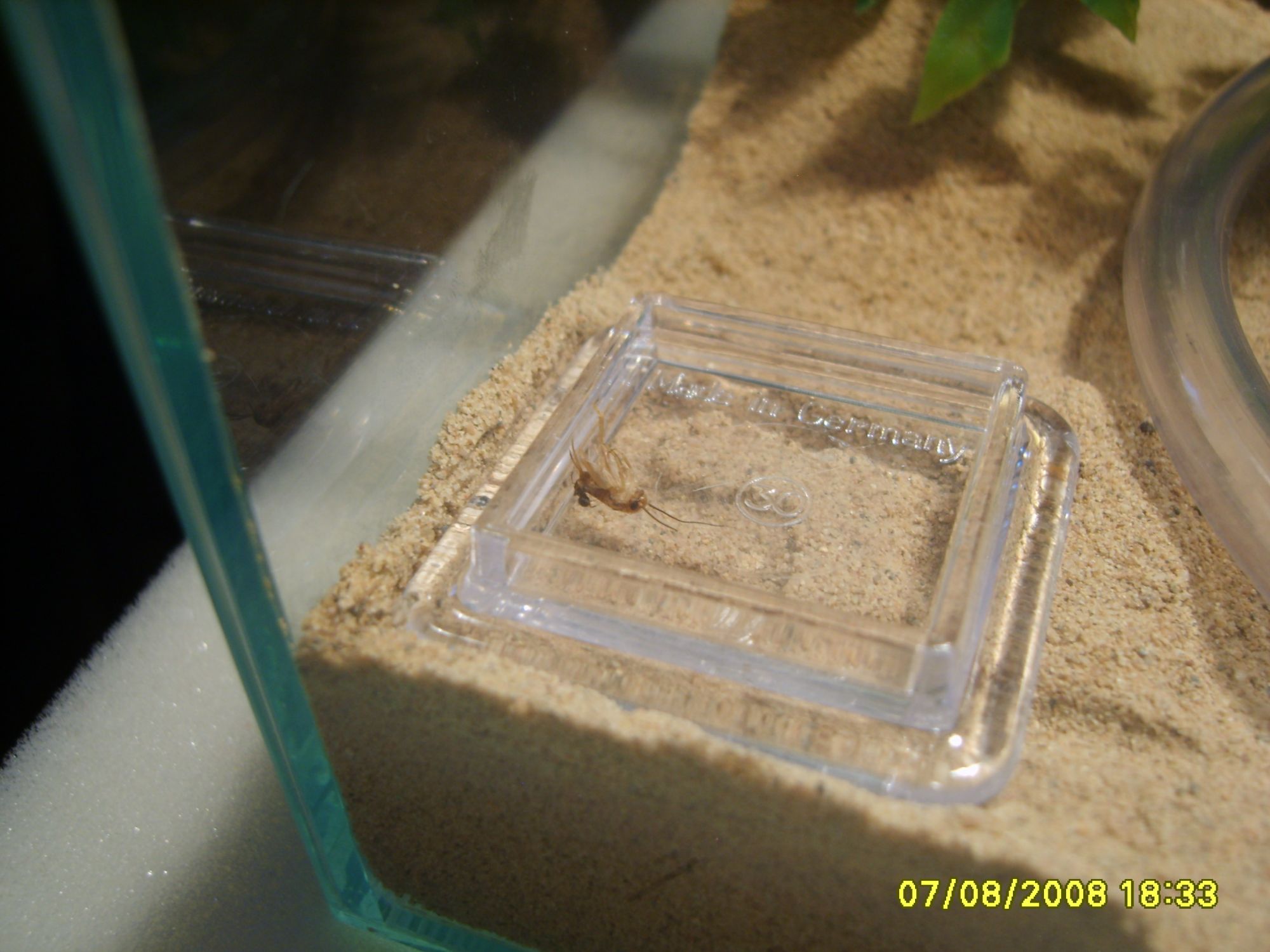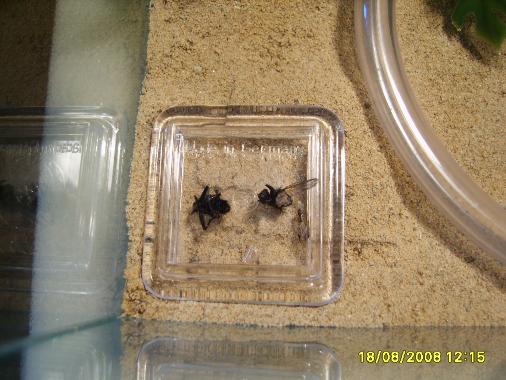 Ich hab heute erstmal wieder meine neue Honiglösung gegeben, dann noch 2 Heimchen und eine Fliege.Ausserdem hab ich das Wasser aus der Tränke ausgewechselt und die Farm bewässert (3ml)