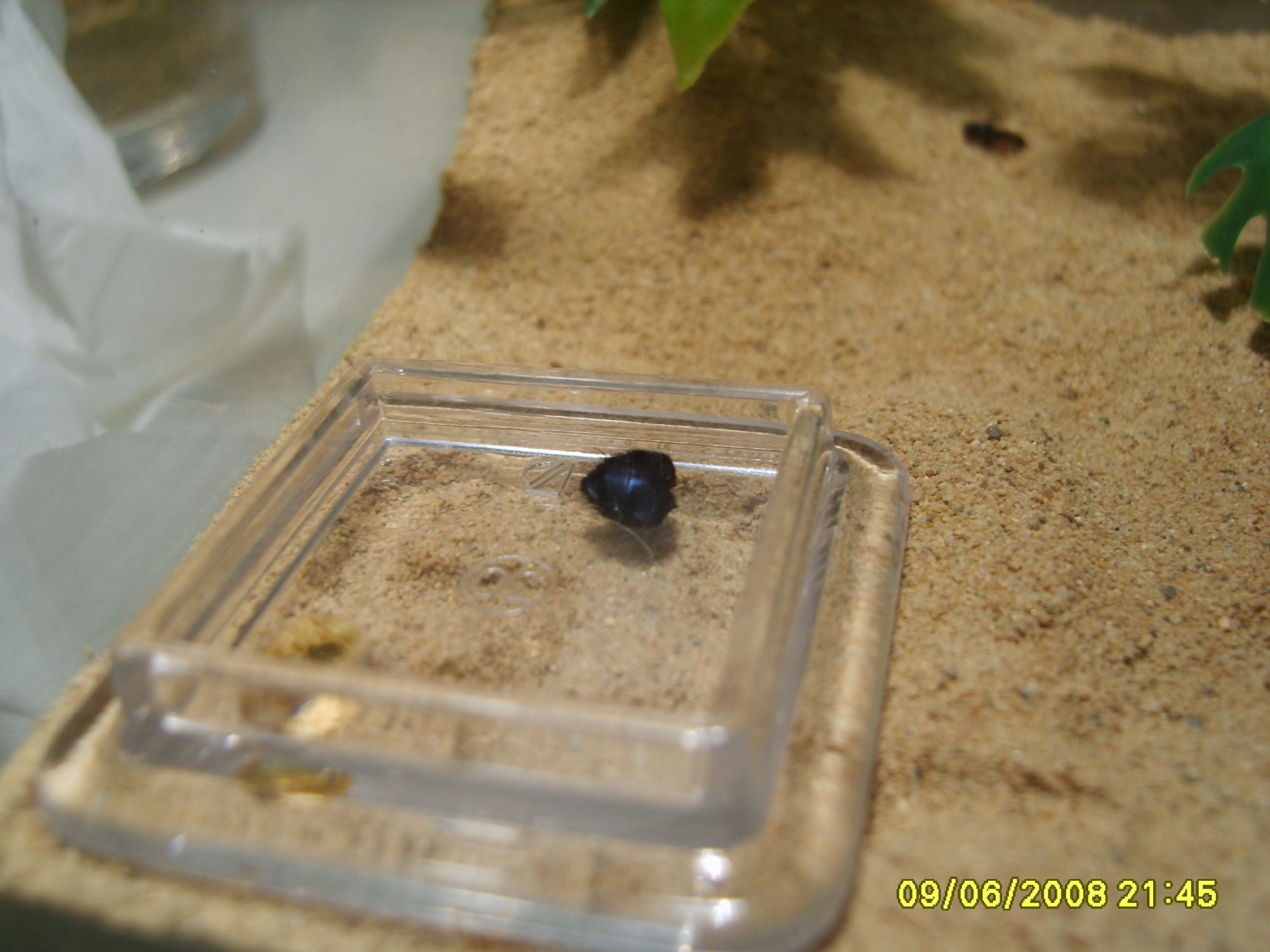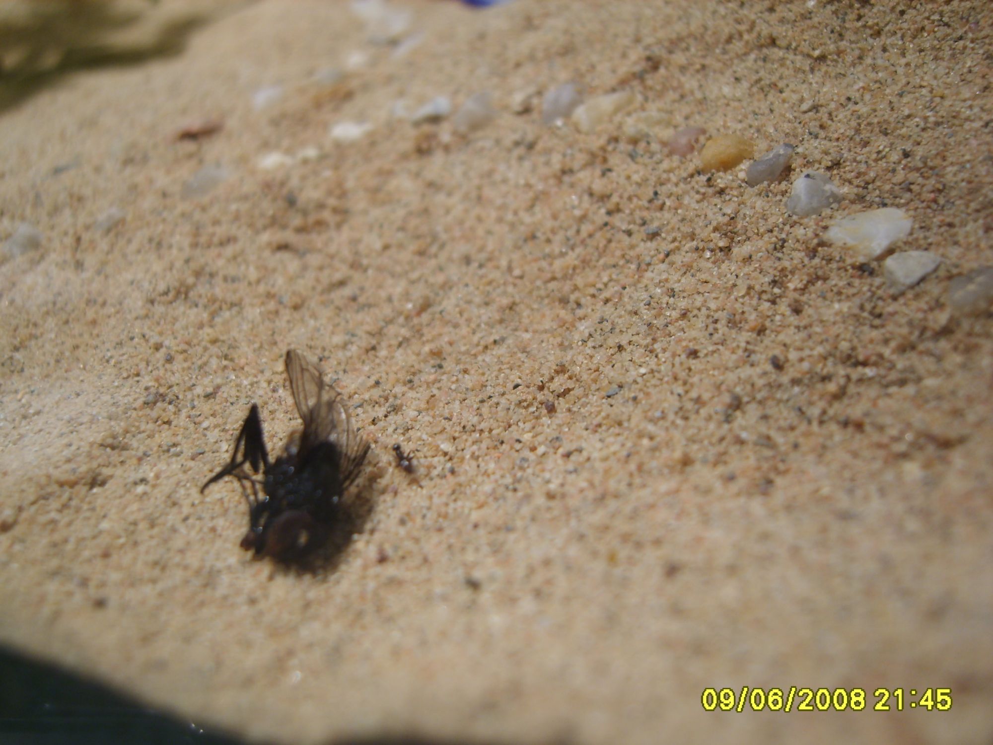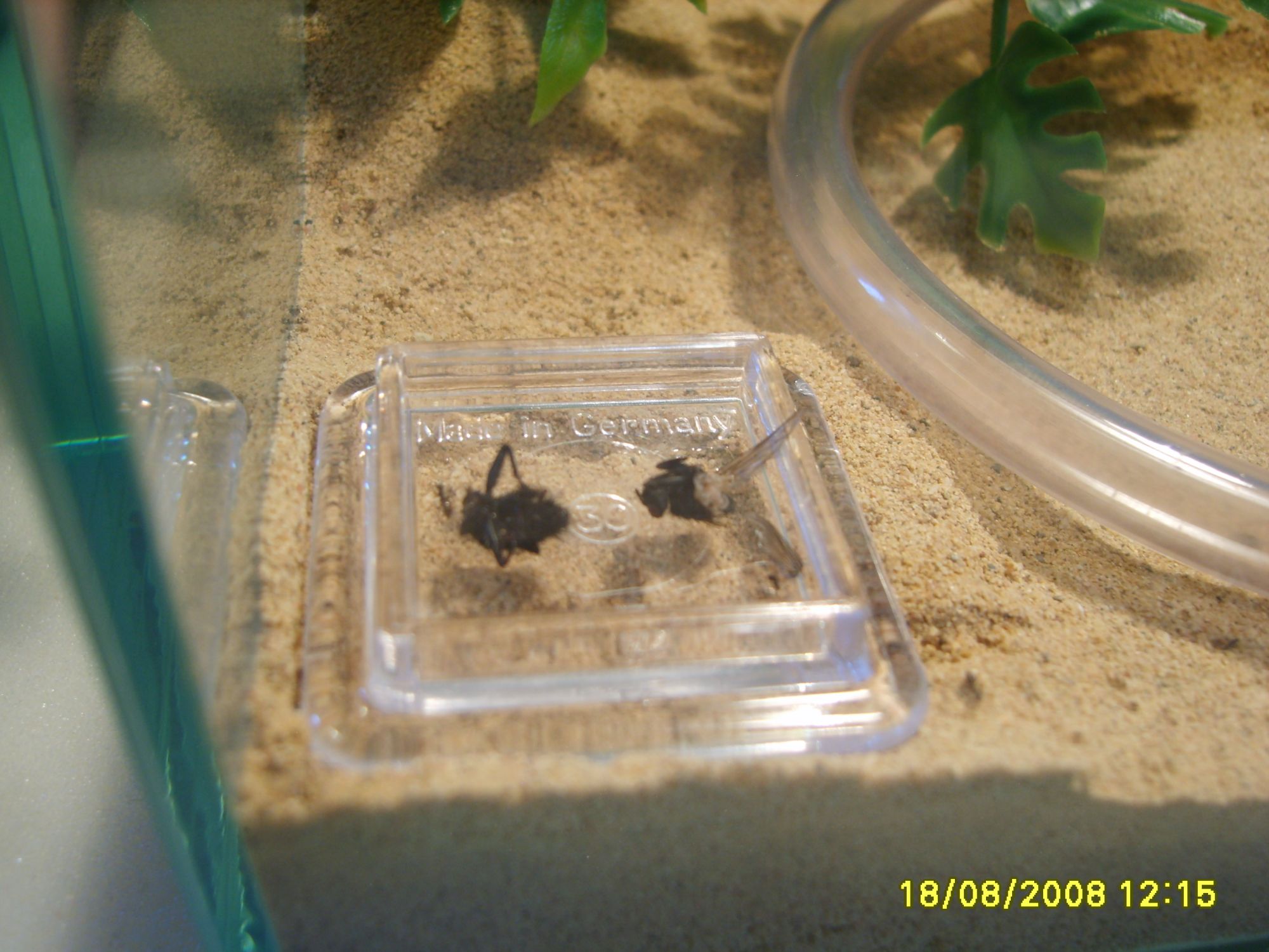 Ich hab heute erstmal wieder meine neue Honiglösung gegeben, dann noch 2 Heimchen und eine Fliege.Ausserdem hab ich das Wasser aus der Tränke ausgewechselt und die Farm bewässert (3ml)