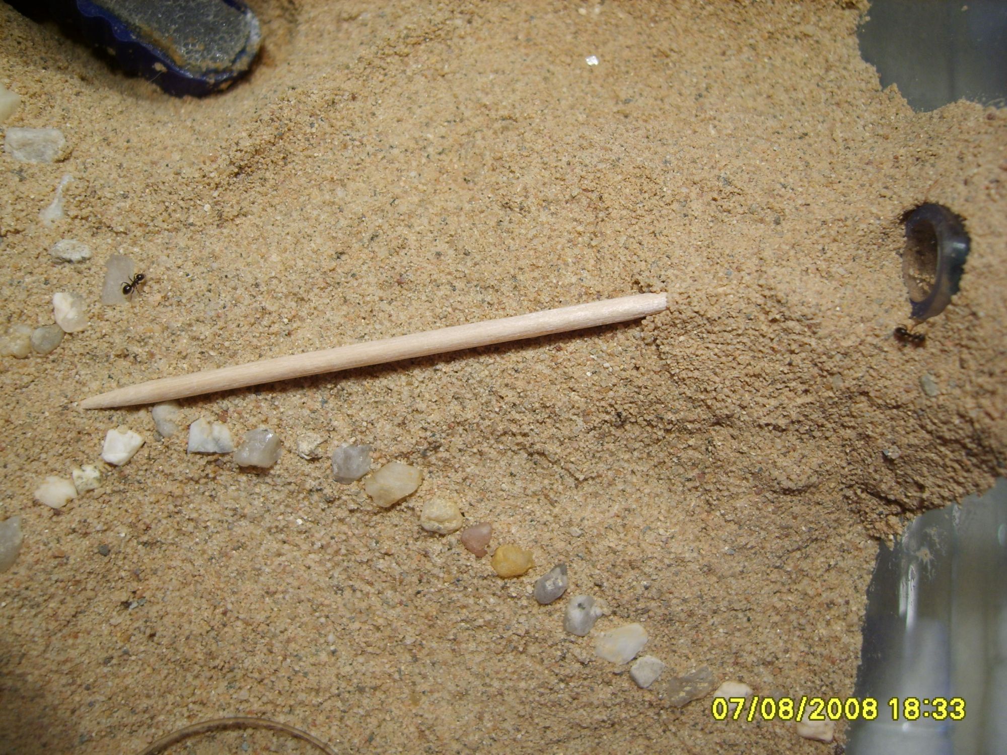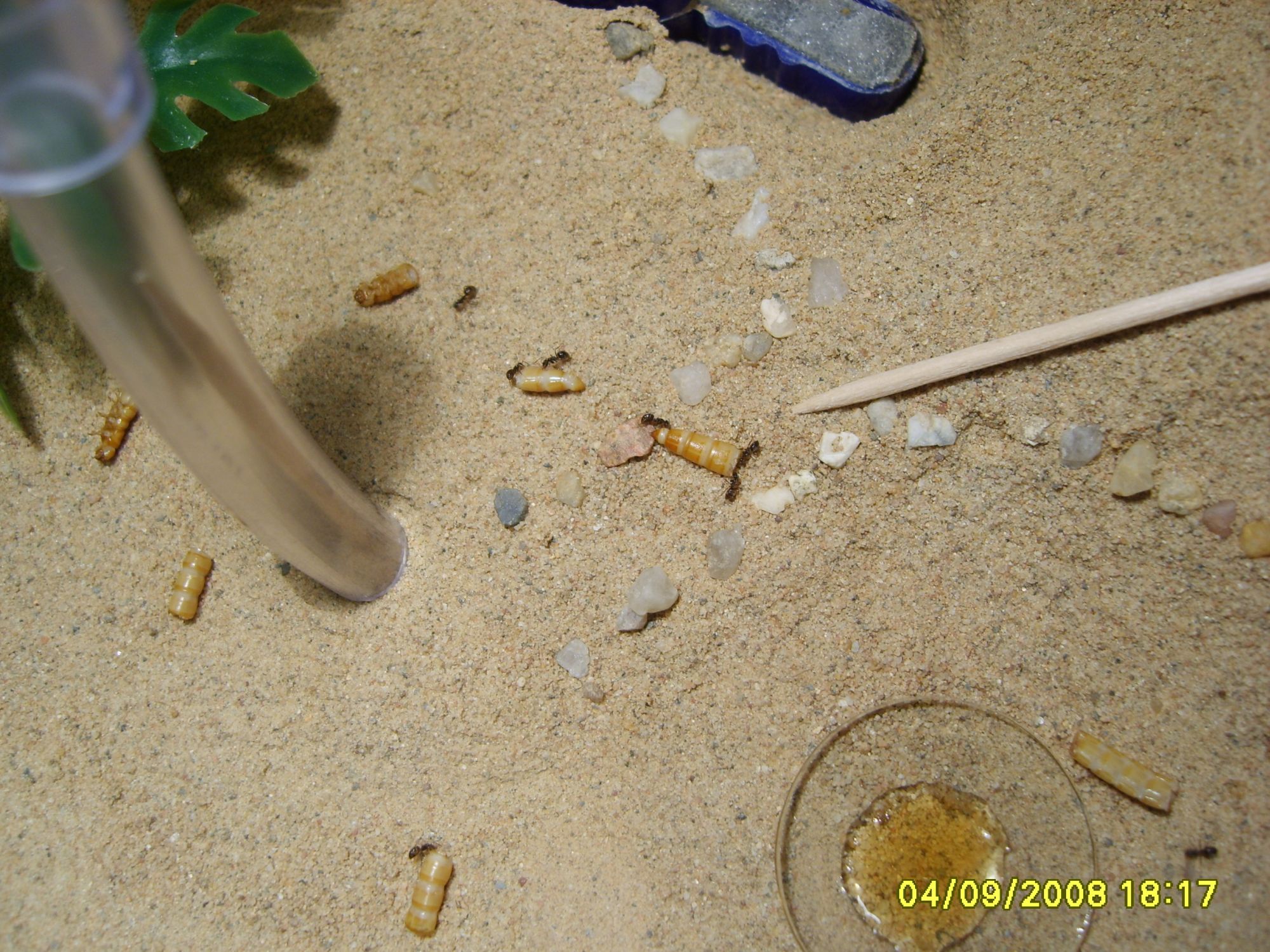 Es sind jetzt immer noch 30 Ants in der Arena, die Hälfte der 10 Mehlwurmstückchen wurden schon in die Farm getragen, und die reslichen werden immer noch schön ausgehöhlt. Also wer bei Lasius niger irgendwie an Mehlwürmer kommt - KAUFEN!