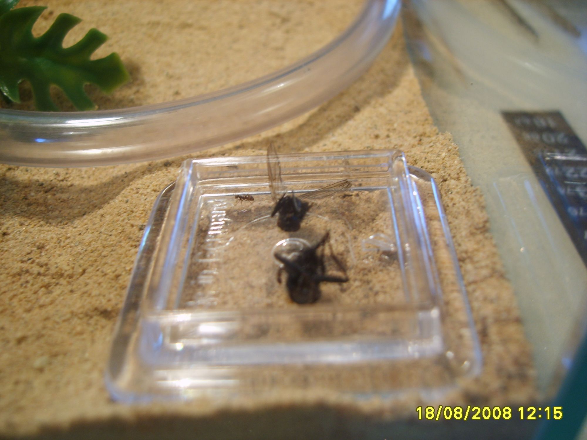 Joa, heute hab ich mal all die alten Insekten rausgetan, und den Müllberg beseitigt. Dann hab ich gleich wieder 3 Heimchen gegeben! Sofort war ein neuer Ameisenrekord aufgestellt. Es waren so 35-40 Ants in der Arena!!