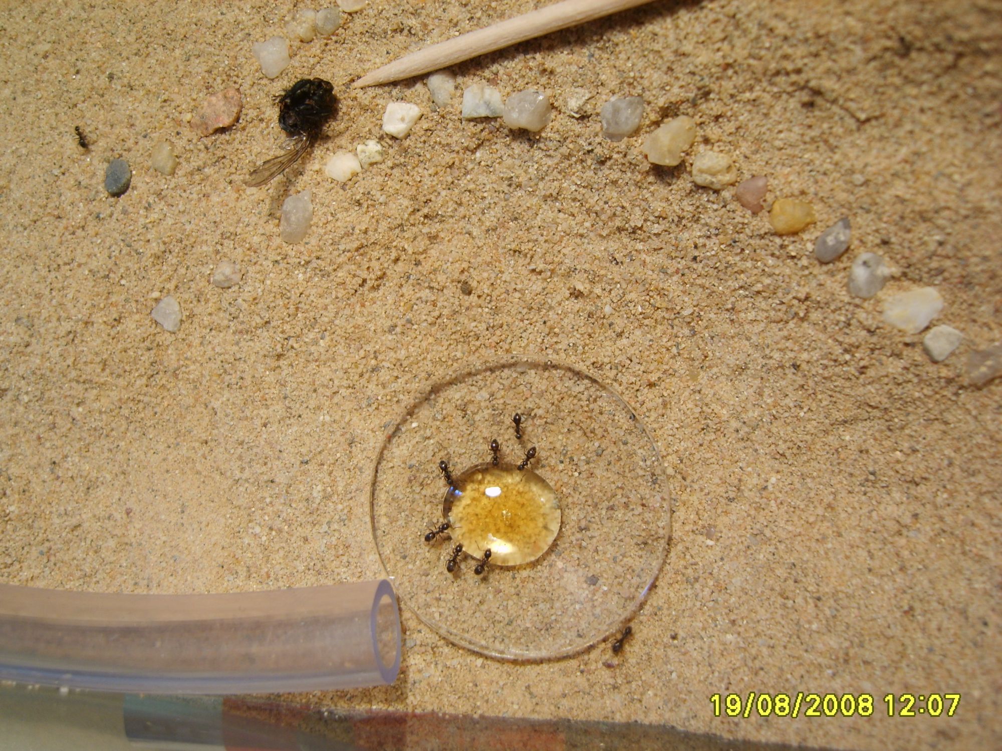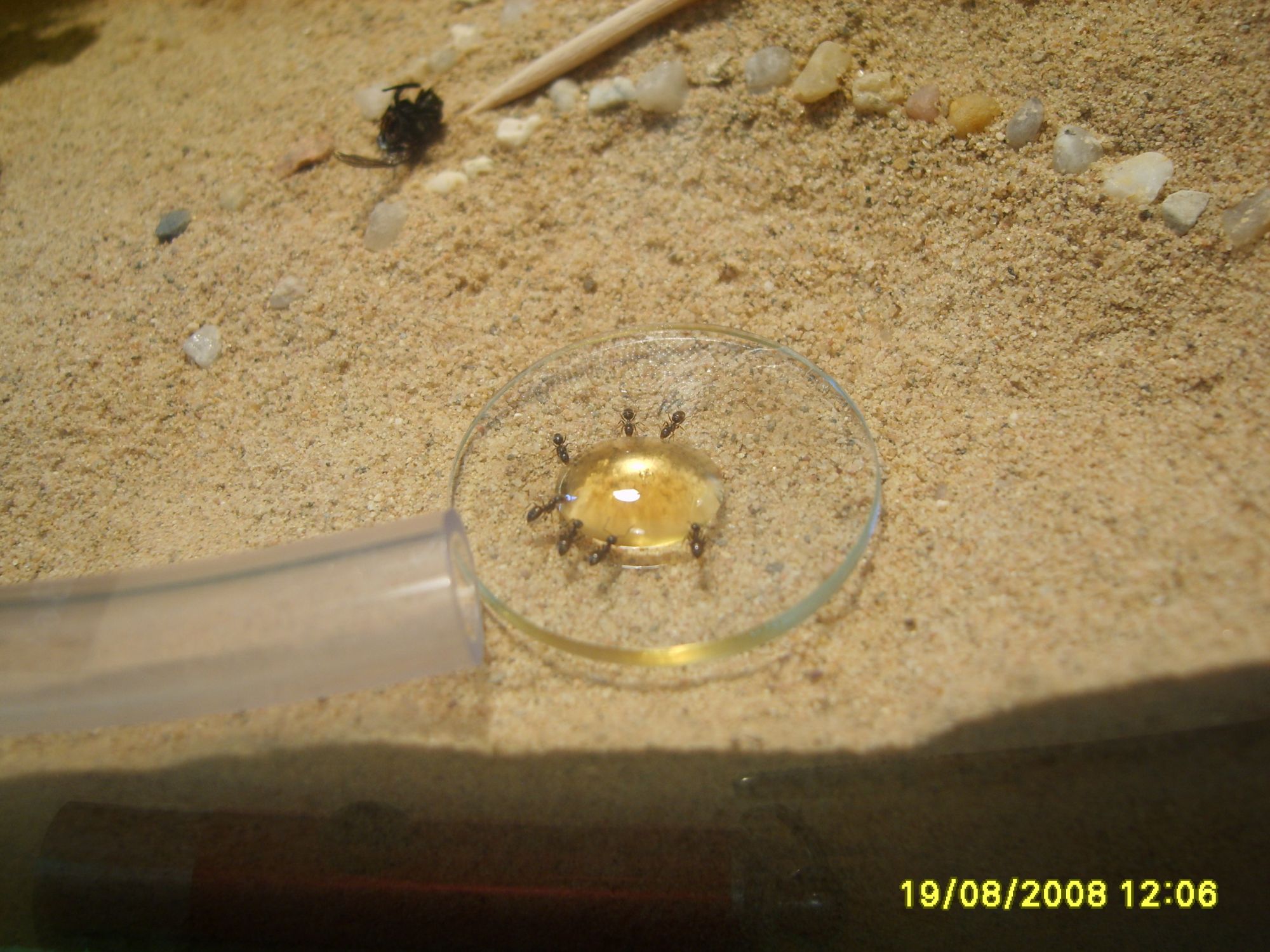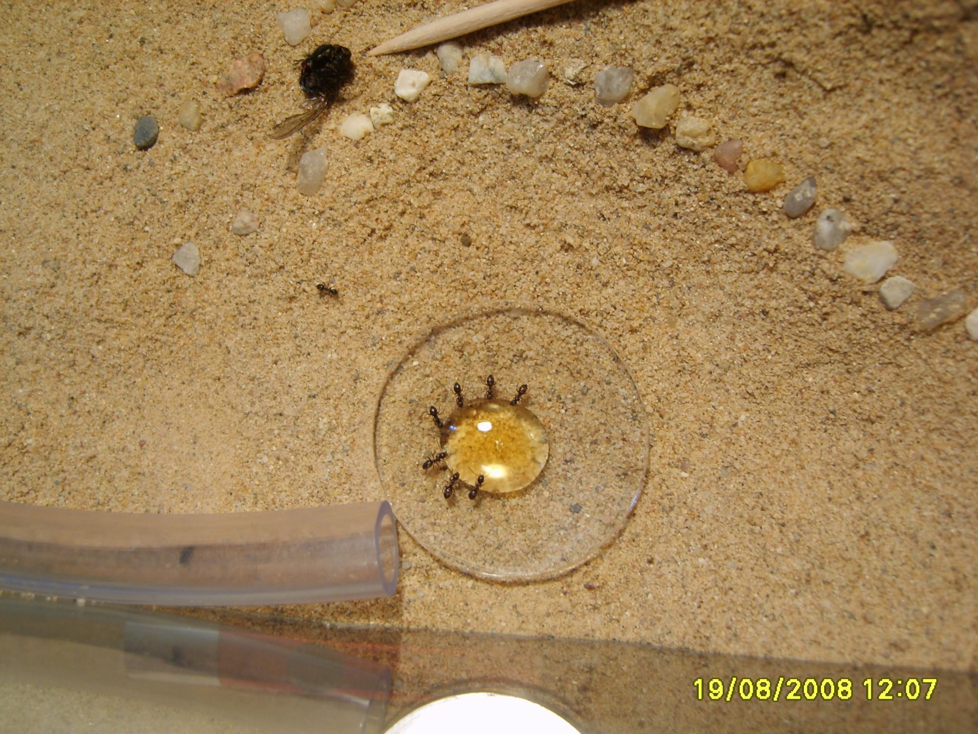 Inmoment sehe ich wieder 4 Ameisen am Honig schlürfen und einige am Heimchen knabbern. "nur" 3 klettern grad an der Glasscheibe rum!