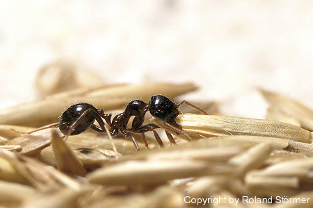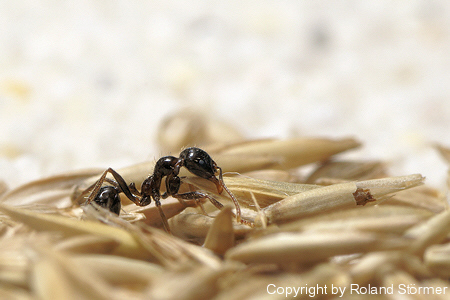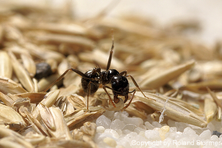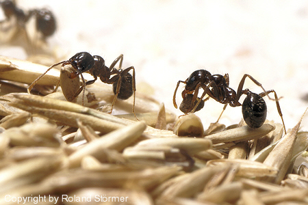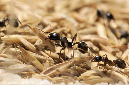 Die Ernteameise "Messor barbarus“ gehört zu den Knotenameisen (Myrmicinae). Messor barbarus sind glänzend schwarz gefärbt. Die hier gezeigten Bilder, stammen von einer Jungkolonie im 2. Jahr. Sie besteht ausser der Königin und der Brut noch aus über 30 Arbeiterinnen.