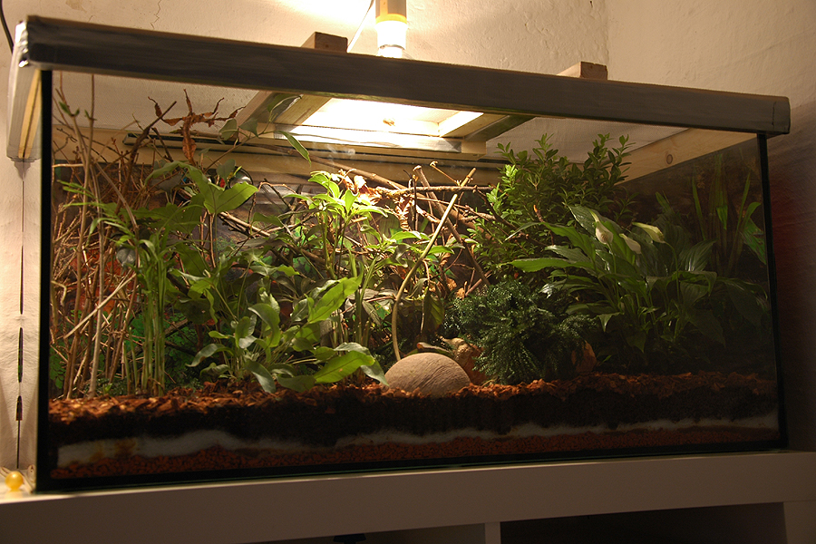 Ich habe mir im letzen halben Jahr ein großes Aquarium (80x35x40cm) zum Tropenterrarium mit echten Pflanzen umgebaut. Hier werden verschiedene Heuschreckenartenk, wie wandelnde Blätter, Gespenstschrecken, sowie Stabheuschrecken gehalten. Außerdem werden darin Heimchen gezüchtet, wo aus einigen Eiern, die in den Boden gelegt wurden, bereits kleine Heimchen geschlüpft sind.