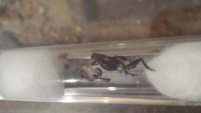 After my Queen died (April 27th 2014) I was left with only 4 workers. The workers slowly died off and I just left the water in there until I could be bothered to clean everything out and start again. After coming back off holiday a few days ago I decided to buy a new queen from Antstore.This afternoon I set about dismantling the nest - ready to clear it all out. I noticed a single worker come out of the nest. A little surprised at seeing any ants still alive I collected it in a test tube with a view to figuring out what to do with it at a later date. Gave it fresh water and a cricket thinking it must be hungry! As I moved more of the sand out of the nest, I saw another worker with something white in its mouth. I scooped that worker up too and then very carefully scraped more sand back. To my disbelief, there are 4 larvae left in the nest!!! I've put all of them in the test tube - it seems the nest had mites in it which is odd because I only give them crickets that have been frozen in the freezer so I'm at a loss as to where they came from. I initially thought that the queen died because it wasn't humid enough for her but since April 27th, there's been no additional humidiy in the nest, no additional food and the only drinks for them was some honey water and clean water. I can't believe how many eggs there are.