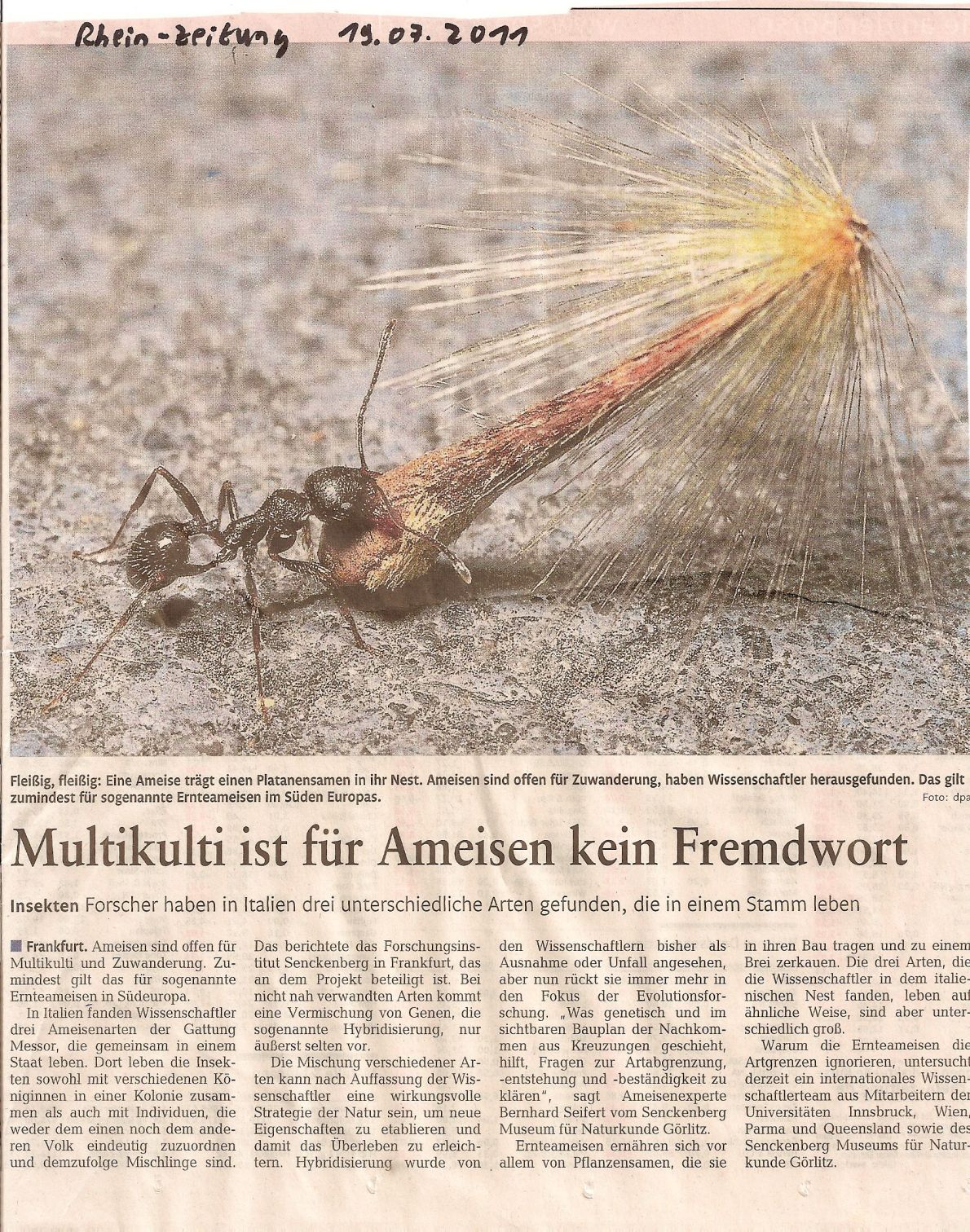 In der Rheinzeitung vom 19.7.2011 stand ein ziemlich interessanter Artikel über das Zusammenleben verschiedener Ameisen z.T. ganz anderer Arten in einem Nest.