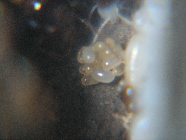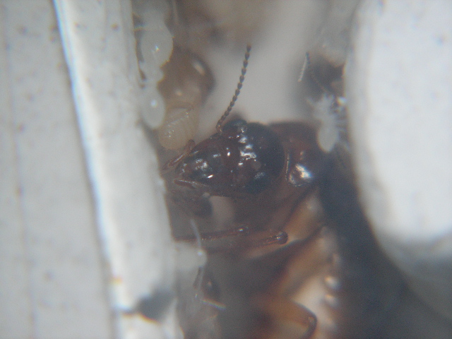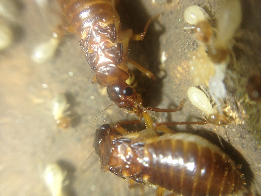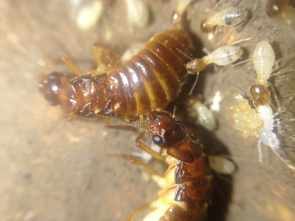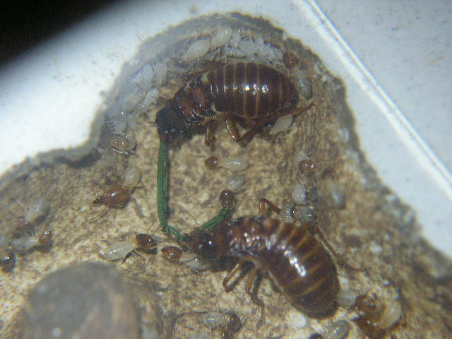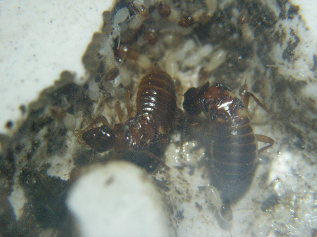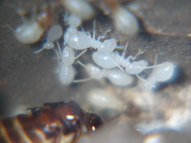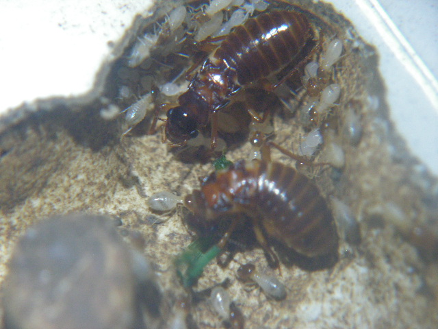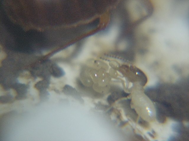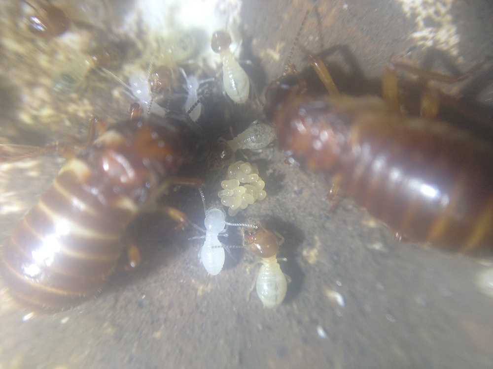 Well well hello there :grin: , My termites are doing well which is great news. A few of the eggs have hatched and now there are some tiny nymphs walking about. Also there has been anouther soldier reach adulthood and several workers too :P There seems to be some more eggs laid as there are several tiny ones in the egg pile. It is interesting to know that termite eggs get bigger closer to hatching which is great as several are larger then the rest so hopfully more are due soon. I havent seen which reproductive is laying but it would be great when i catch the queen in the act as i would be able to tell them apart then lol. The colony has been eating dry grass that i have been putting in the end of there chamber. The workers are finding it and bringing back to the queen and king who as well as the workers feed upon it. I have noticed a change in the workers abdomens, they have gotten darker which is a really good sighn that they are eating somthing. :D