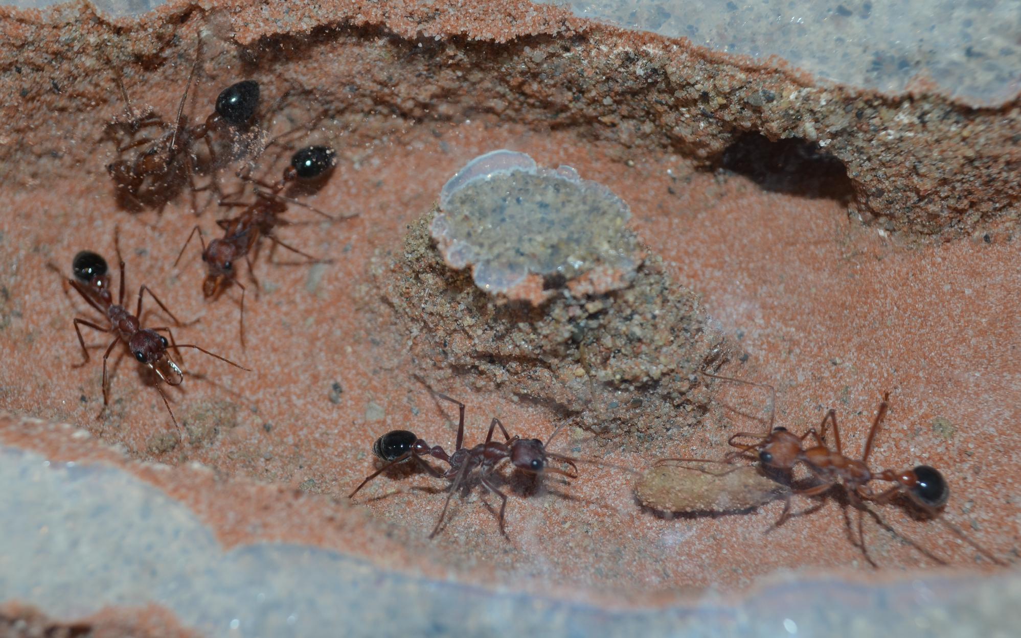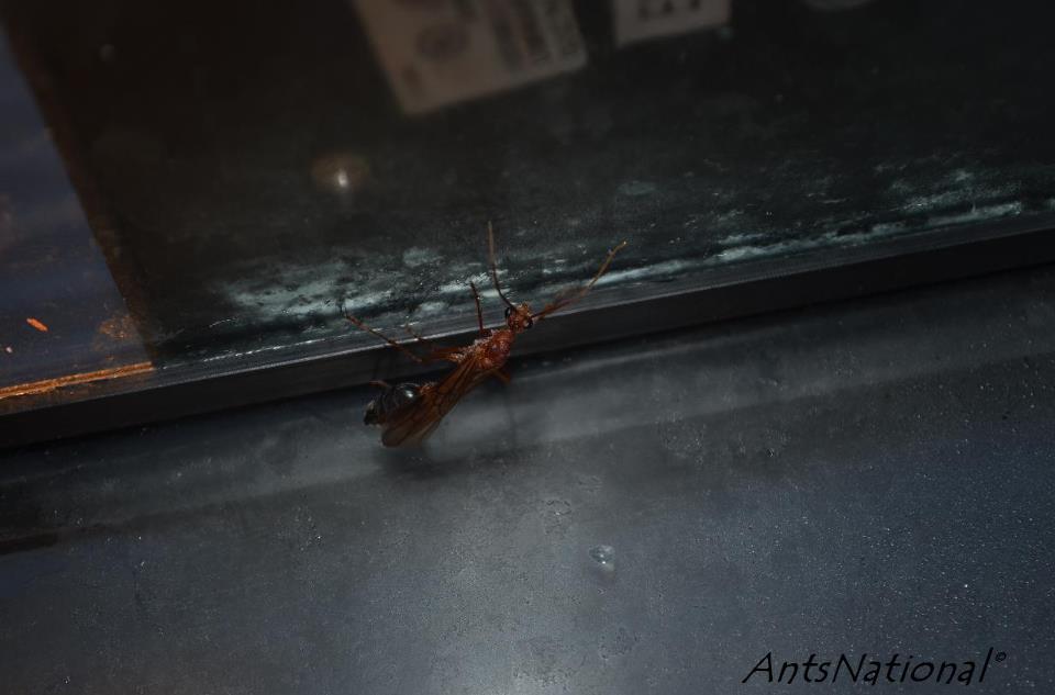 The introduction of male and female reproductive ants goes peacefully. This excited male flies around the breeding enclosure searching for a mate.
