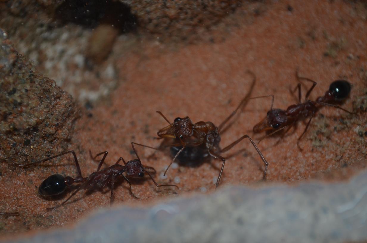 After 5 males hatched, I placed 3 males along with the 6 princesses into a specialized breeding enclosure. There has been positive results in the aspect of peace and no killing, but there hasn't been any reproducing yet. The males have been busy flying around but so far nothing except more haploid eggs. It has been rumoured that Myrmecia can produce multi-queen colonies along with mating within a nest. Let's hope that these rumours are true! So far the 6 queens and the 3 males are being observed in their 'safe house' together, with females cleaning eachother and the males. :)