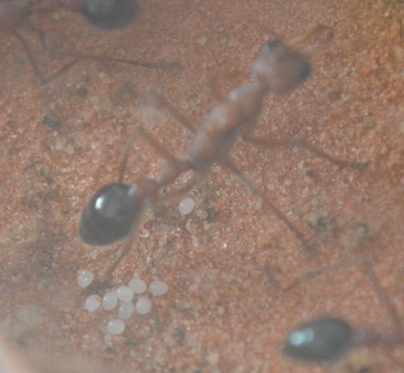 Ten pearly white little eggs are now present within the nest. The queen stands over her clutch.