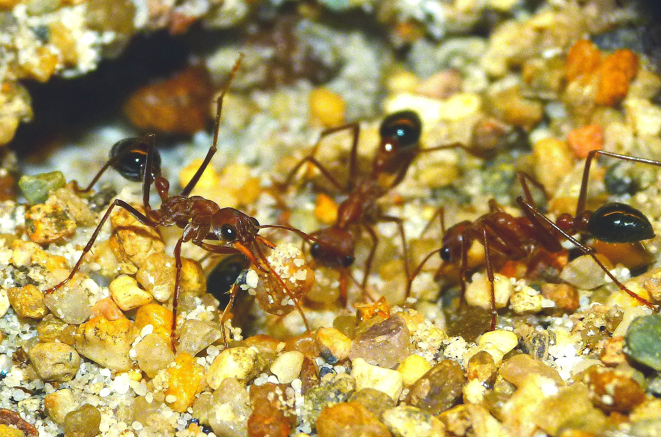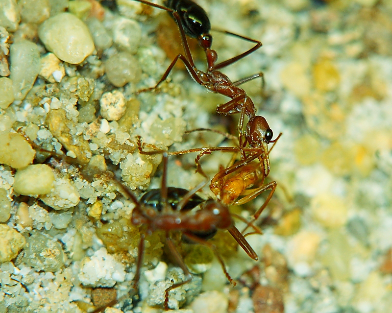 Eine frisch geschlüpfte Arbeiterin, die nicht lebensfähig ist, wurde aus dem Nest geschleppt. Das Verhalten der älteren Arbeiterinnen gegenüber dieser Jungameise ist Uneinigkeit. Einige belecken sie, andere zerren daran.