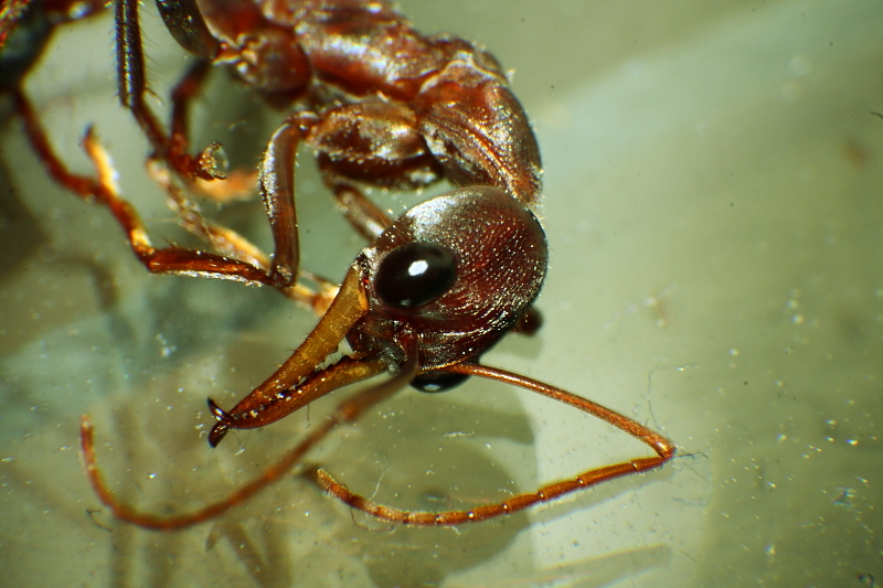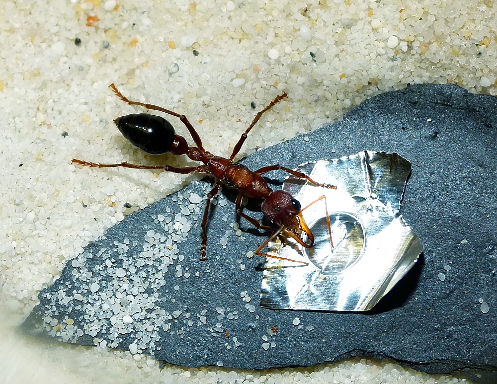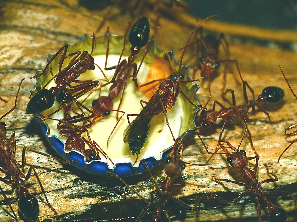 Entweder sind sie nicht hungrig oder ein totes Insekt erweckt bei diesen Ameisen kein besonderes Interesse. Meine zappelnde Pinzette scheint ihnen eher zu gefallen.