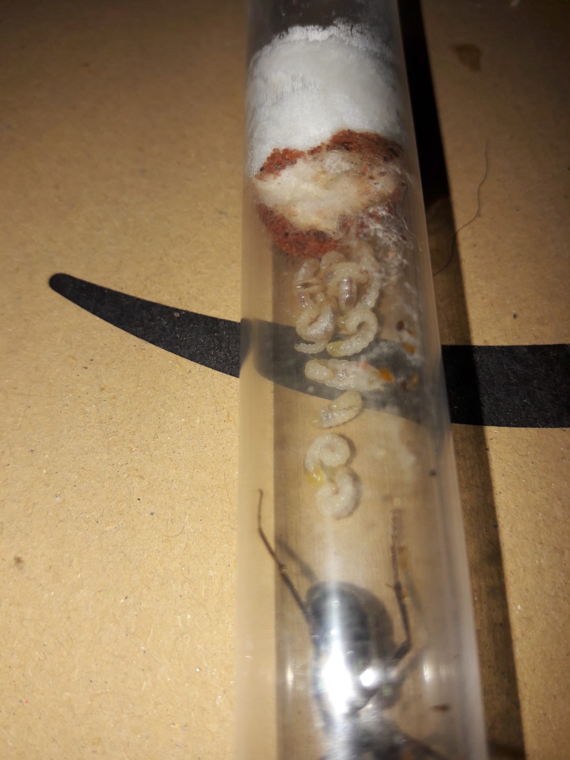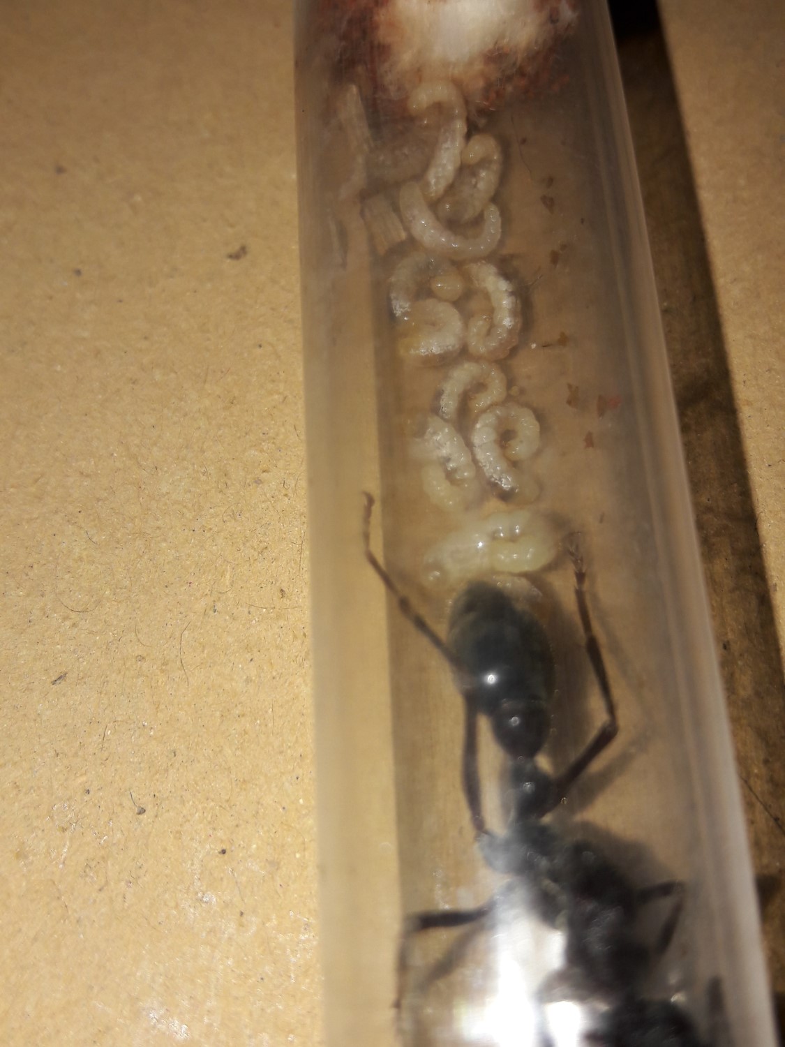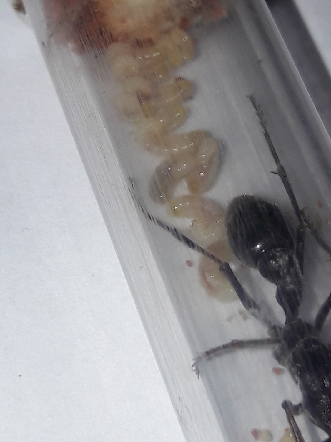 Hallo, der perfekte Start ist erst einmal gelungen. Die Gyne hat am ersten Tag bei mir gleich drei Eier gelegt. Einen Tag zu vor hat sie bereits beim Händler noch einen neuen Brutzyklus eingeleitet. Während der Gründungsphase legt die Art nur dann Eier, wenn bereits das Puppenstadium der vorherigen Eier erreicht wurde. Sie hat eine Puppe. Die Entwicklung bis zur fertigen Arbeiterin soll 7 Wochen betragen. Das diese wirklich in etwa drei Wochen schlüpft, kann bezweifelt werden. Die Ankunft in Deutschland wurde teuer bezahlt. Der Wassertank im RG war undicht. Puppe 2 hat es nicht geschafft. Der Plan der Myrmecia pyrifomis Gyne ist es, wenn in ca. 4 Wochen die ersten Larven schlüpfen, soll bereits die erste Arbeiterin da sein und sie bei der weiteren Aufzucht unterstützten Respekt wenn ihr Plan aufgeht.