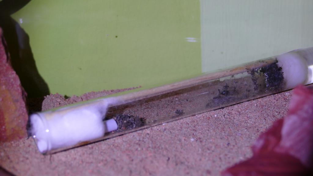 Heute gibt es mal wieder etwas Positiveres zu berichten. Als ich heute am Abend heimgekommen bin und mit der Taschenlampe ins Formikarium geleuchtet habe, konnte ich im Strohhalmeingang drei Puppen erkennen. Somit haben sich tatsächlich schon wieder Larven verpuppt. Laut anderen Haltungsberichten ist die Zeit von Puppe zu geschlüpftem Imago wohl recht lange. Wenn ich mich richtig erinnere ca. drei Wochen.