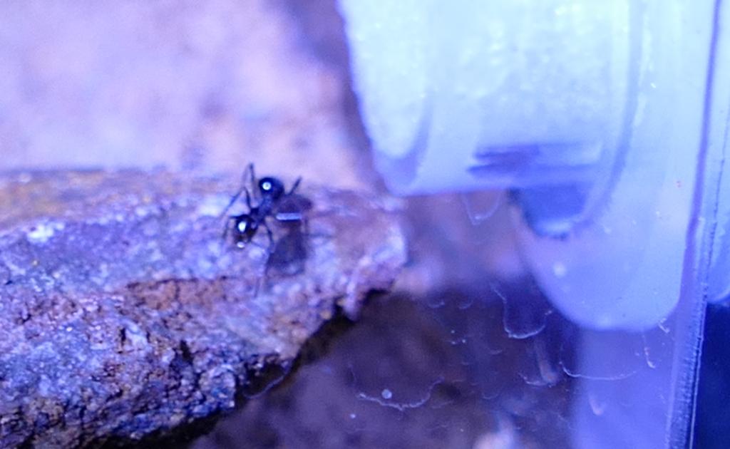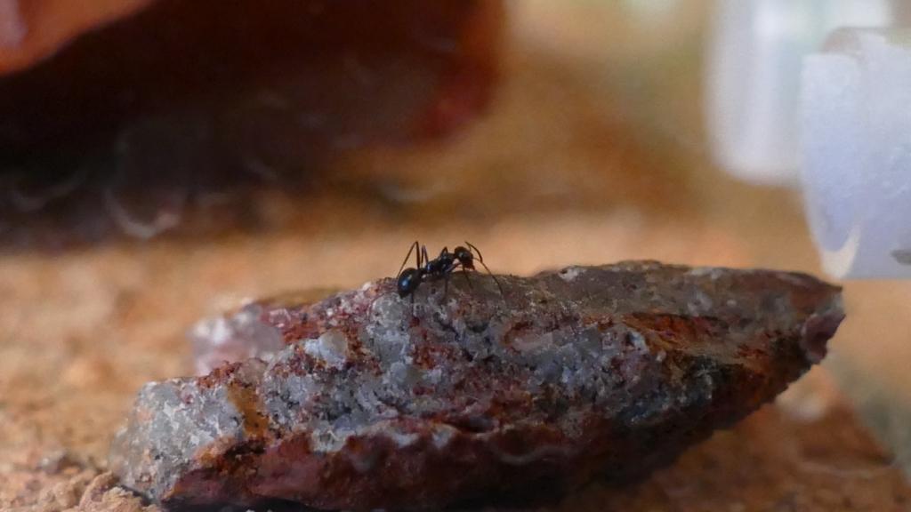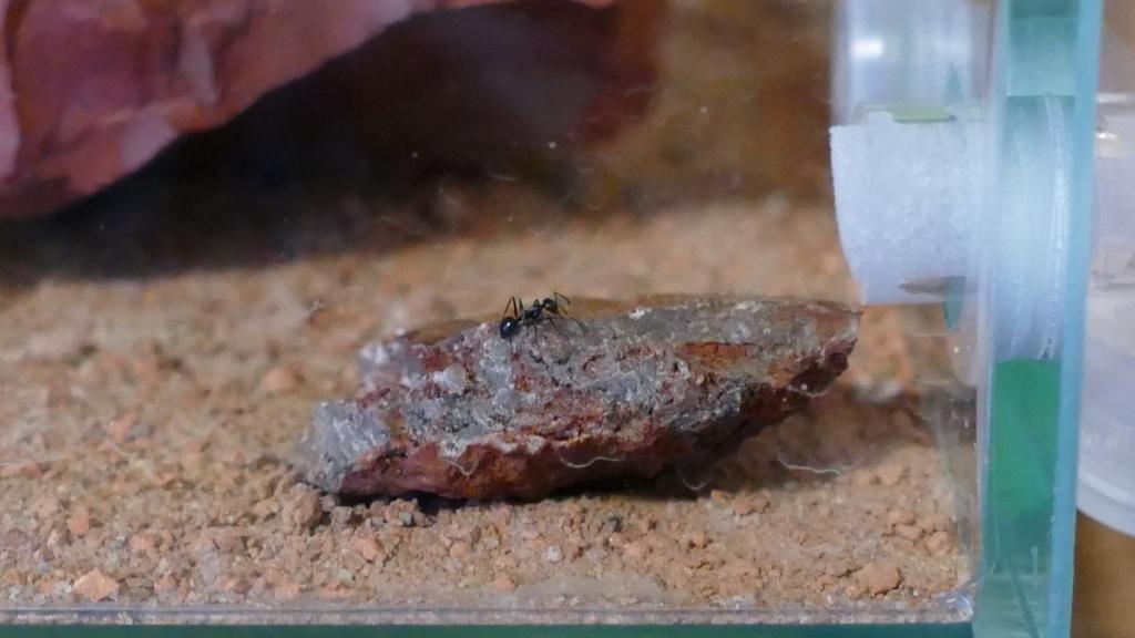 Auch waren heute morgen drei Arbeiterinnen im Formikarium unterwegs. Eine davon saß regungslos auf dem kleinen Stein vor der Wassertränke. Anbei drei Bilder von ihr. Erst beim Durchsehen der Bilder auf dem PC konnte ich erkennen, dass sie einen Flüssigkeitstropfen zwischen den Mandibeln hat, vermutlich Wasser aus der Tränke. Wenn man genau hinschaut ist es auf dem ersten Bild erkennbar: