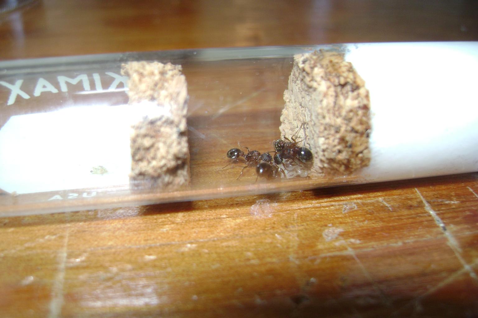 In this past late summer of 2011 I managed to catch a number of queens. I also believe that I've caught 2 Myrmica ruginodis queens as well as they differ slightly from the others. I've kept these queens together in test tubes. Myrmica spec. are not claustral, and need to forage whilst they raise their first brood. In colony A, I have 4 queens. Colony B has 2 queens. I tried putting them together once but it was unsuccessful (no damage to any queen). I had a third tube which I gave to a friend of mine to keep.