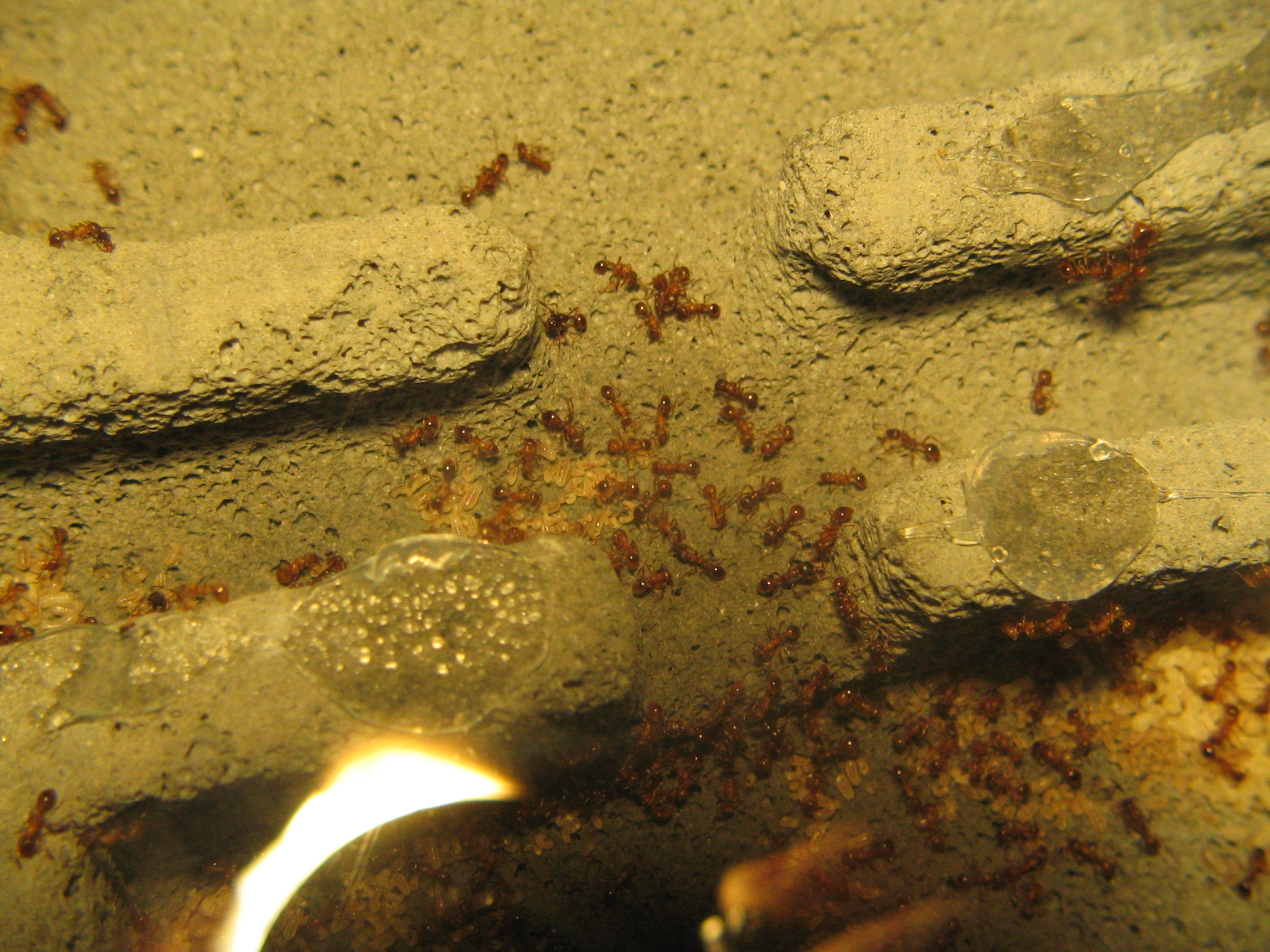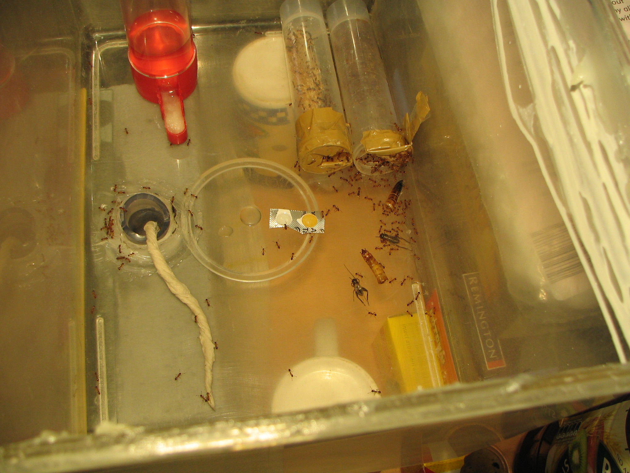 This afternoon i fed them 2 live crickets.. one was killed and dragged to the nest within 5 minutes by just 3 workers.. The second proved a little difficult.. he kept jumping all the time.. in the end they cornered it inside a test tube.. didnt really stand a chance then.. was swarmed by about 30 workers.. and now there aint much left of either of them, they are certainly eating the food i give them very quickly.. which can only be a good thing :D