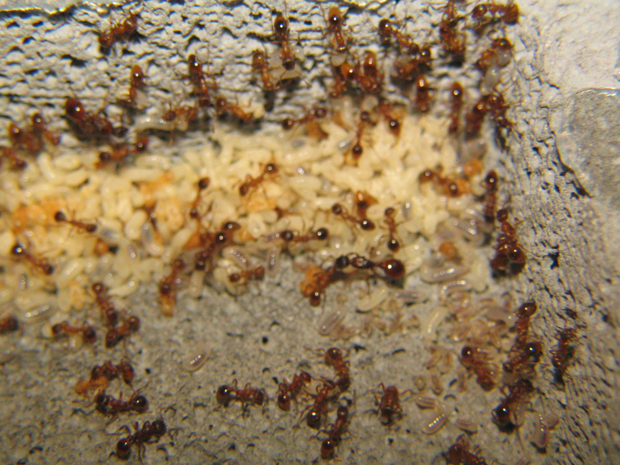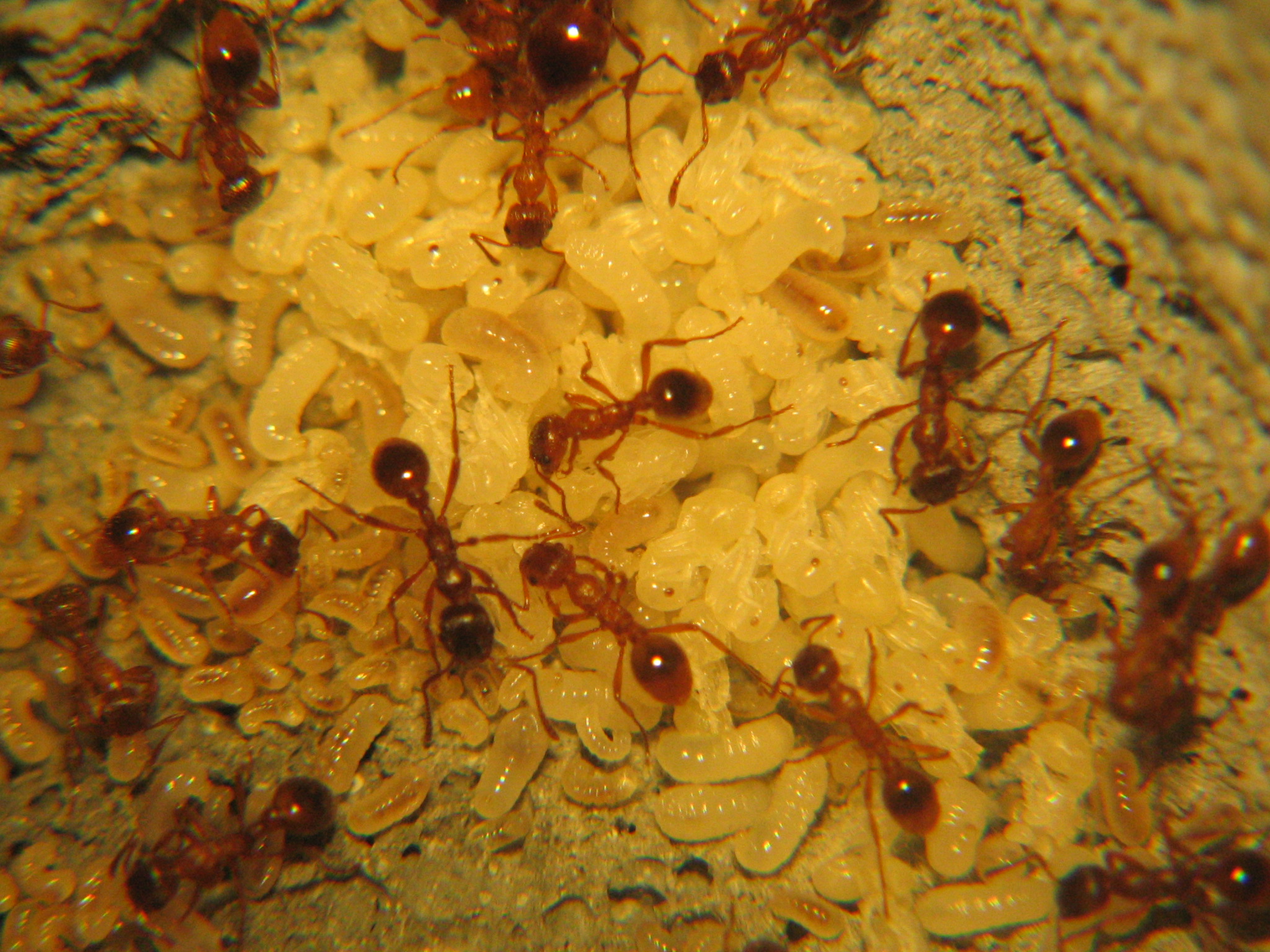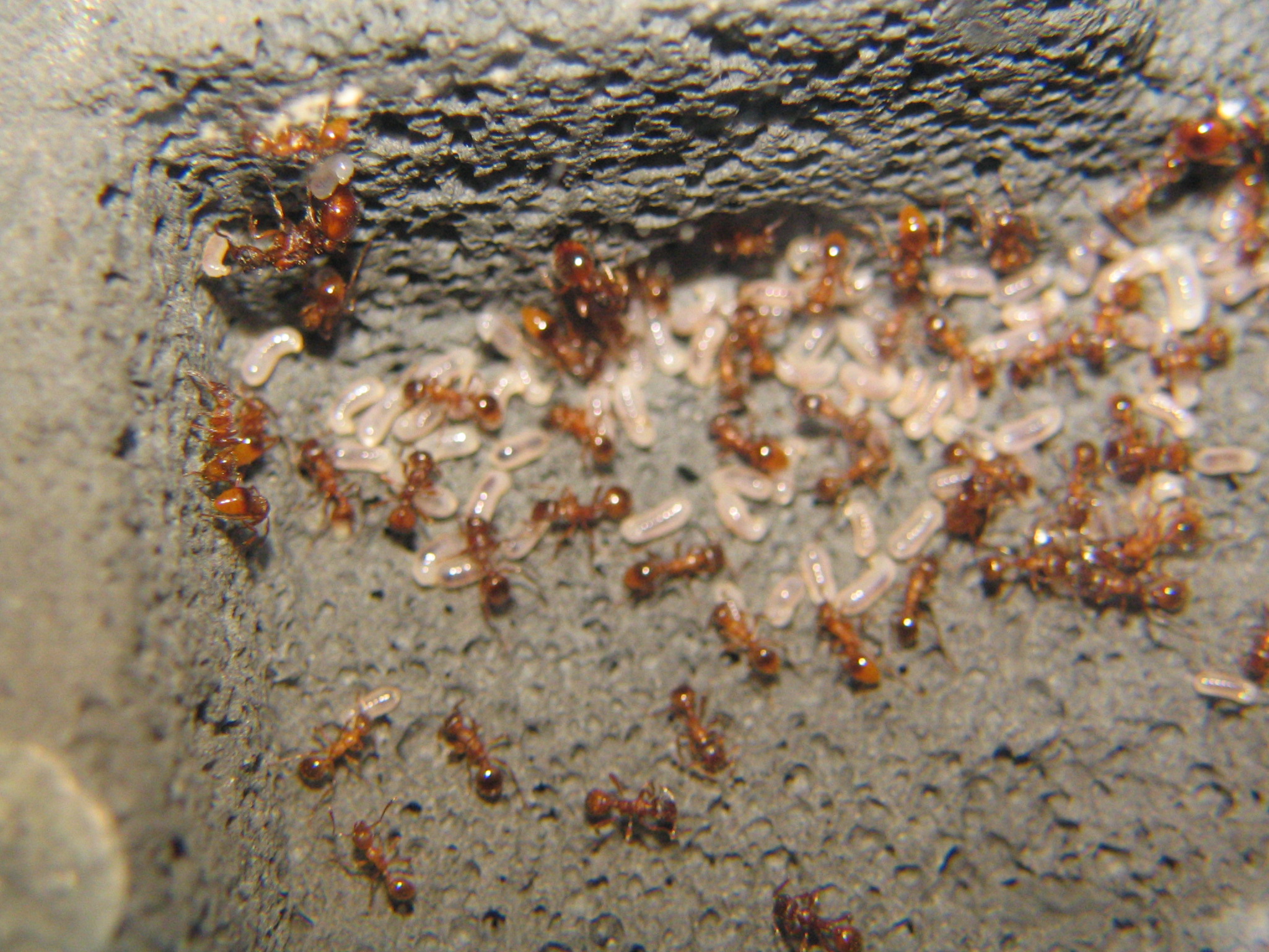 They looks happy of the level of humidity:The larvas are spread on the ground .When it is to dry (or to damp ) the myrmicas put the larvas in high piles.