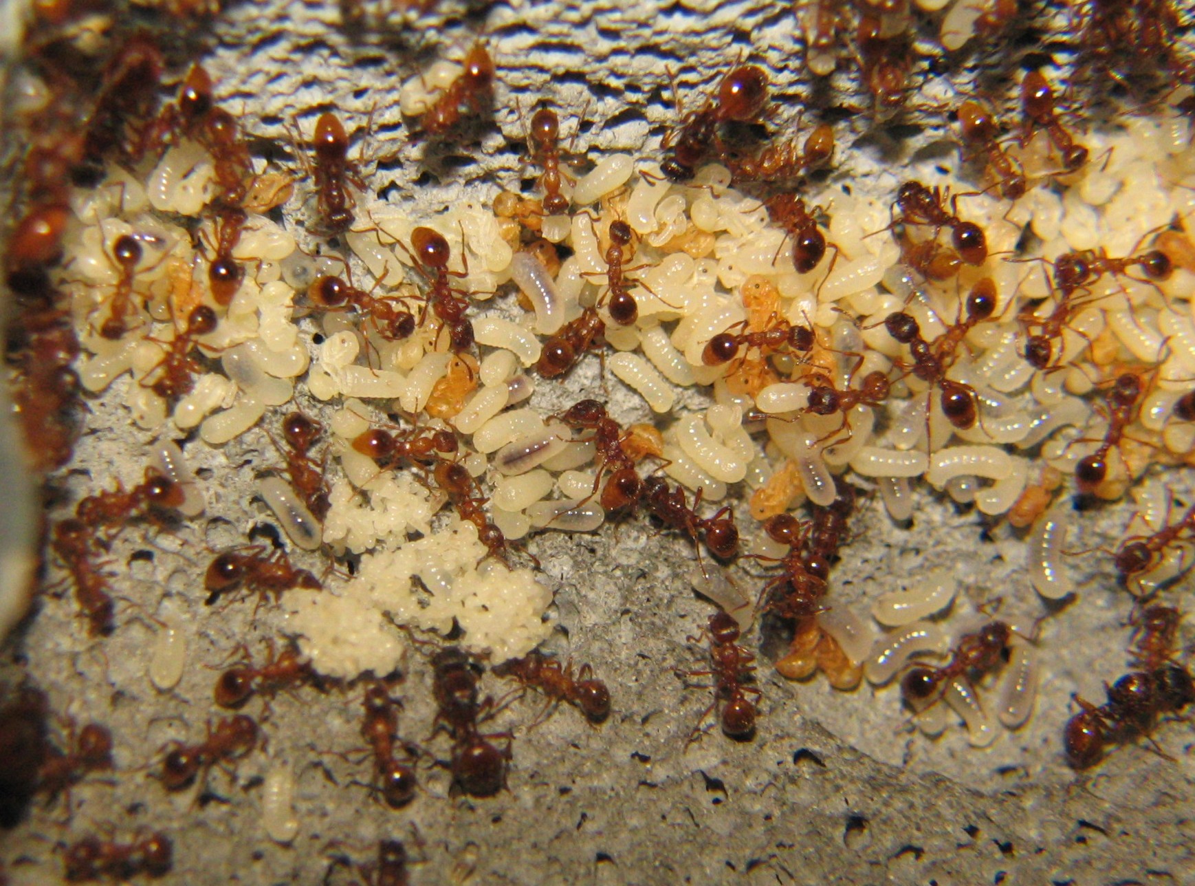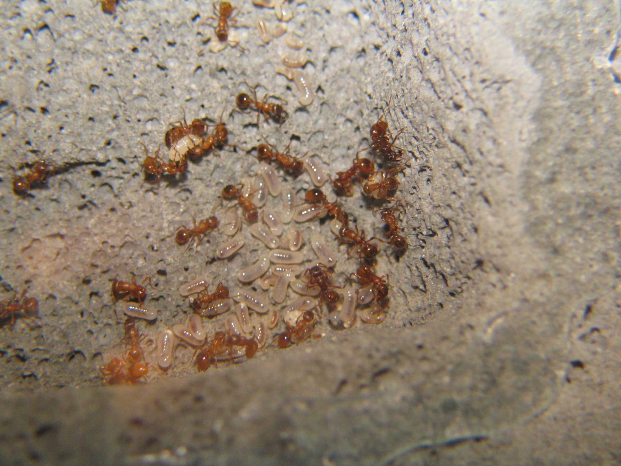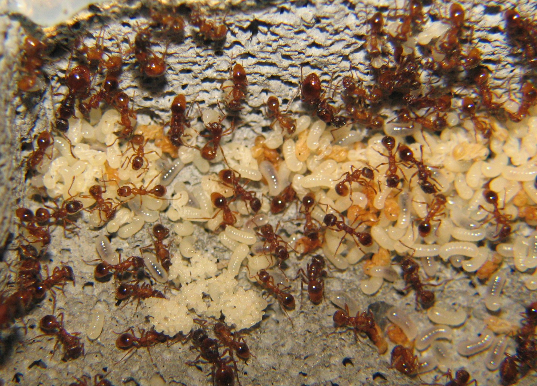 They looks happy of the level of humidity:The larvas are spread on the ground .When it is to dry (or to damp ) the myrmicas put the larvas in high piles.