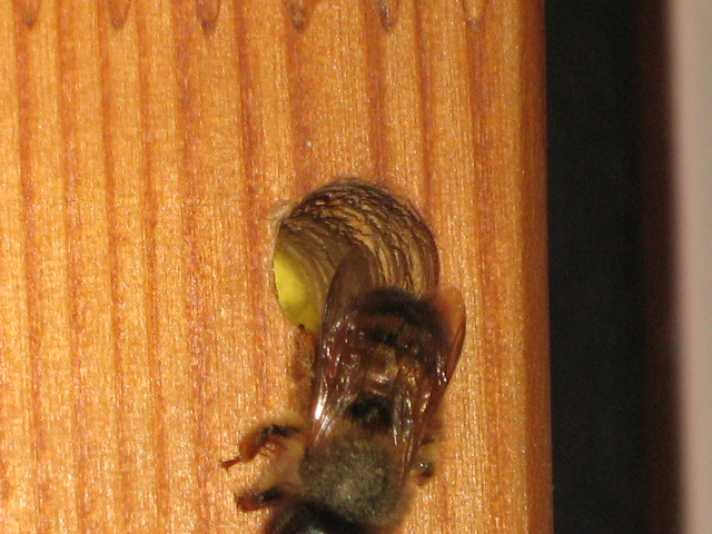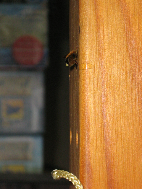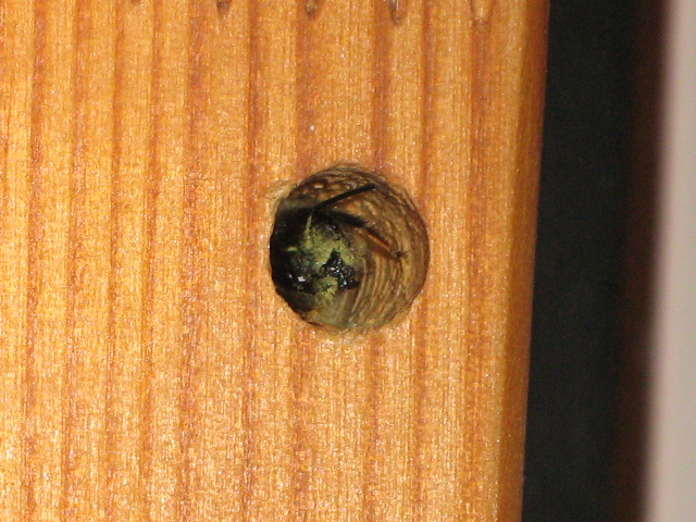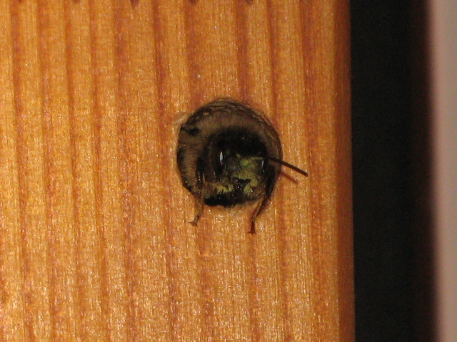 Da ich die letzten Wochen das Fenster eigentlich nur noch offen stehen hatte, hat eine Wildbiene den Weg in mein Zimmer gefunden und nach einigem Erkunden das Ikea Regal kurzerhand zur Brutstätte erkohren. Inzwischen machen ihr zwei weitere Damen Konkurrenz. Mich freut's so hat das häßliche alte Ding doch was Schönes.