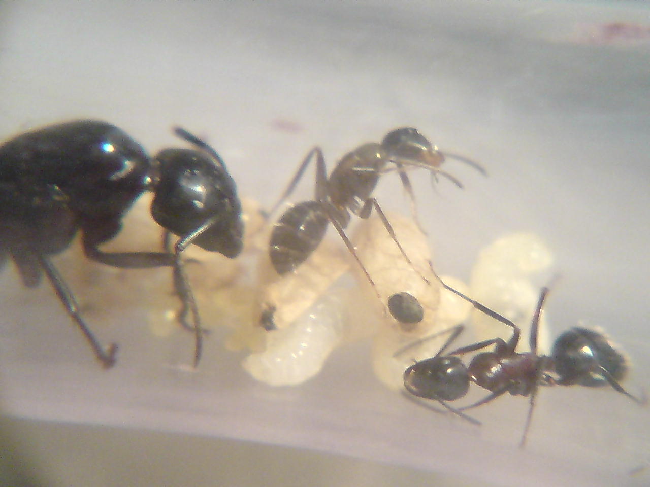 Anyway its around 17 eggs, 5-10 larvae all stages, 2-3 cocoons (cant make my mind up if there is another since queen is over it all the time), 4 workers and of course the queen