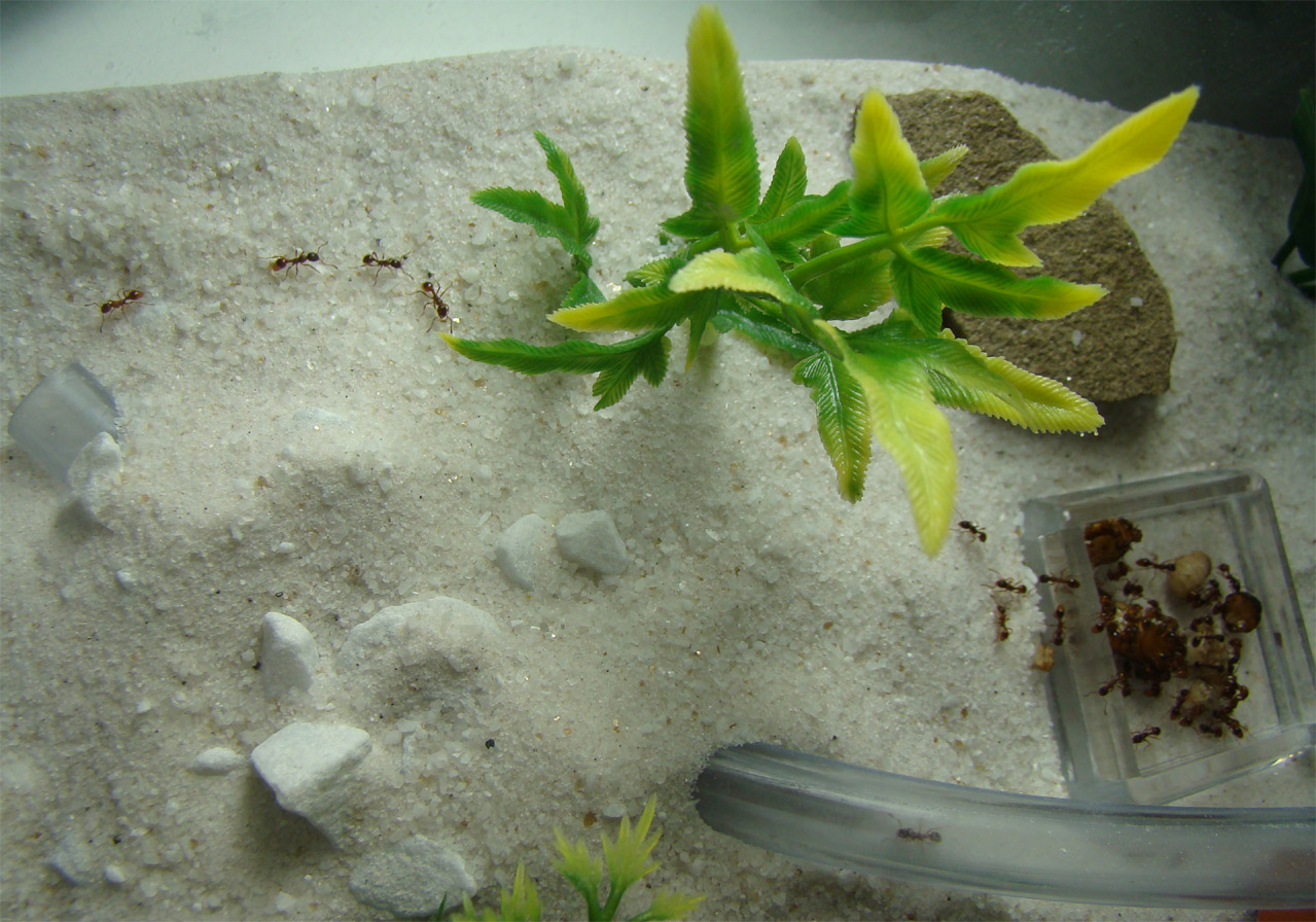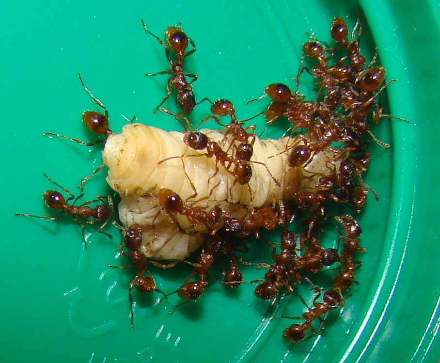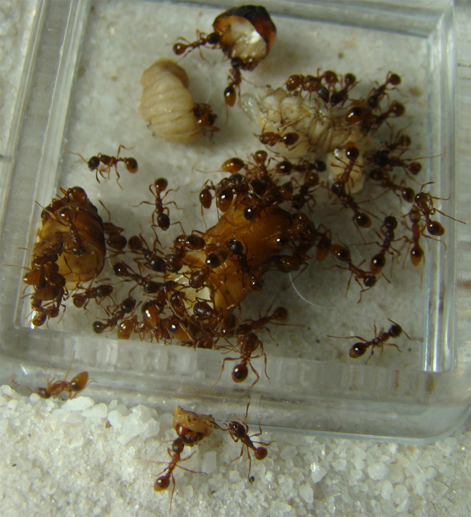 Just a few more pics from putting in two freshly sliced waxworms. One was just a plain waxworm (ie still in maggot/caterpillar form), the other was in a chrysalis, and I basically sliced it in three so the ants could get to the juicy insides. They seem to love them both. As usual, the head of the waxworm has already been dragged in to the nest. Earlier today, before I gave them the fresh waxworm, I watched them take about 6 fairly large pieces of the fish food flakes into their nest as before. Wax worms, fish food flakes, and a honey&sugar water mix are what my colony seem to mostly be living off, with the ocassional interest in fruit (mostly apple) I try them with.