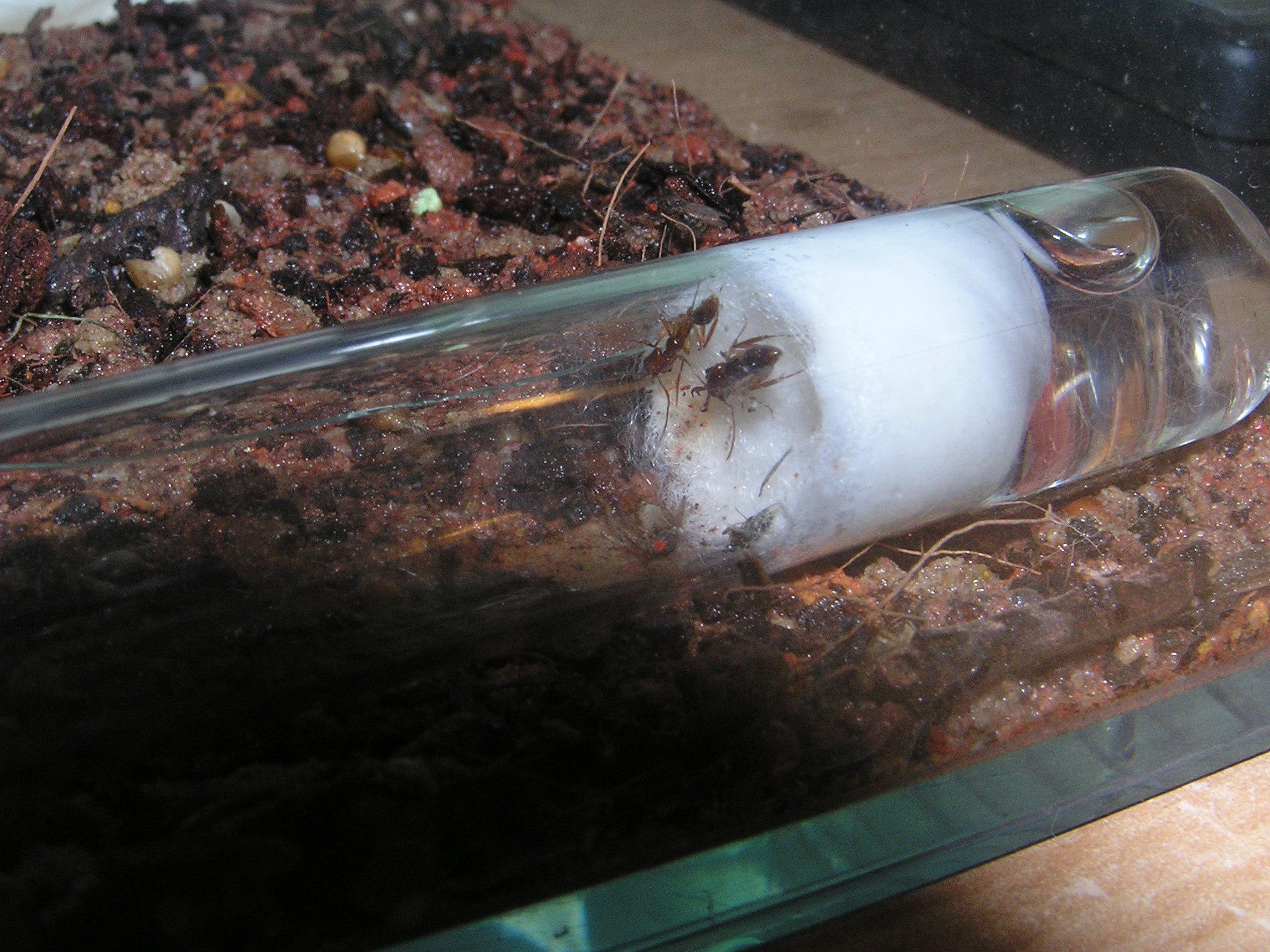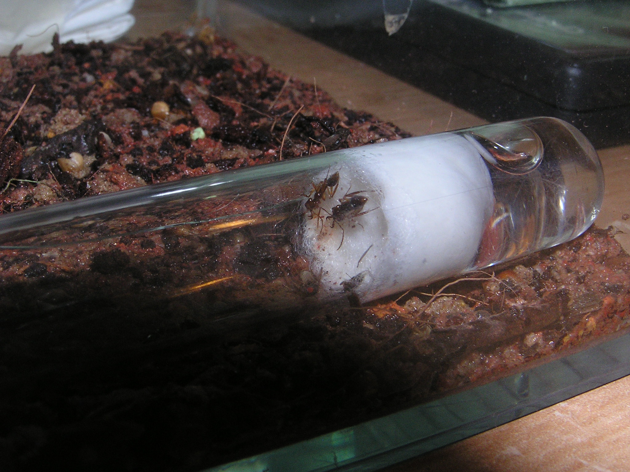 Die dominatere Arbeiterin von beiden hat schon eine Drosophila gejagt und gefangen, welche schon im Nest liegt.(Die Gyne lutscht diese gerade wieder aus, sie wird nie satt und ich hoffe das sie dann bald fleißig Eier legt)