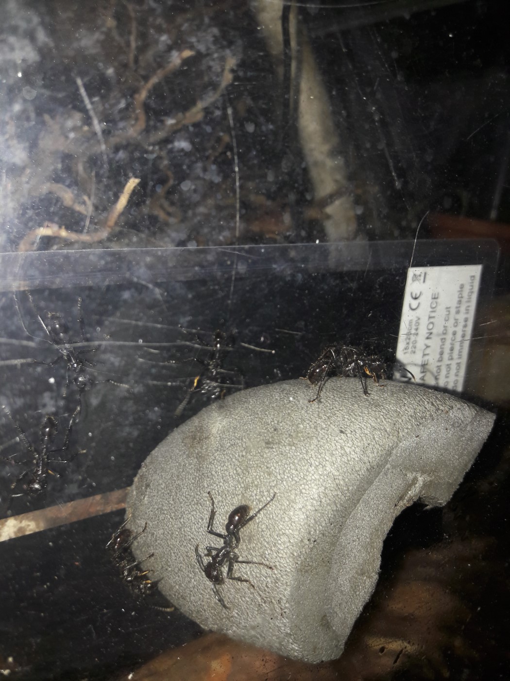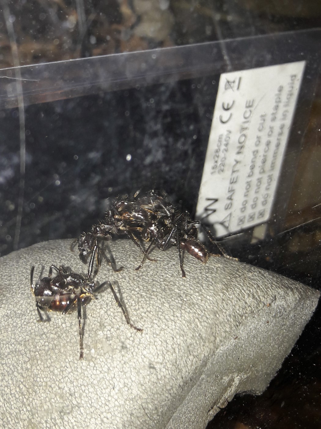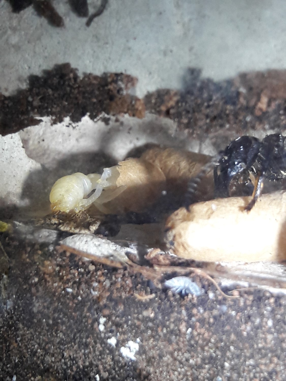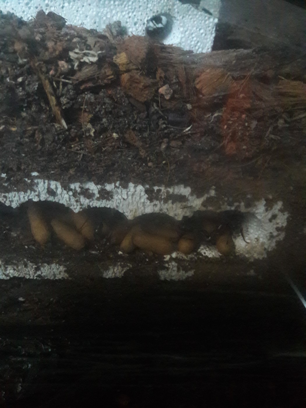 Die Anderen sitzen leider immer noch unter dem Rindenstück. Sie haben das Ytong Nest noch nicht angenommen. Ihnen habe ich eine Plastikbox übergestülpt. Gyne 4 hat keinen Zugang mehr, möchte nichts anbrennen lassen.