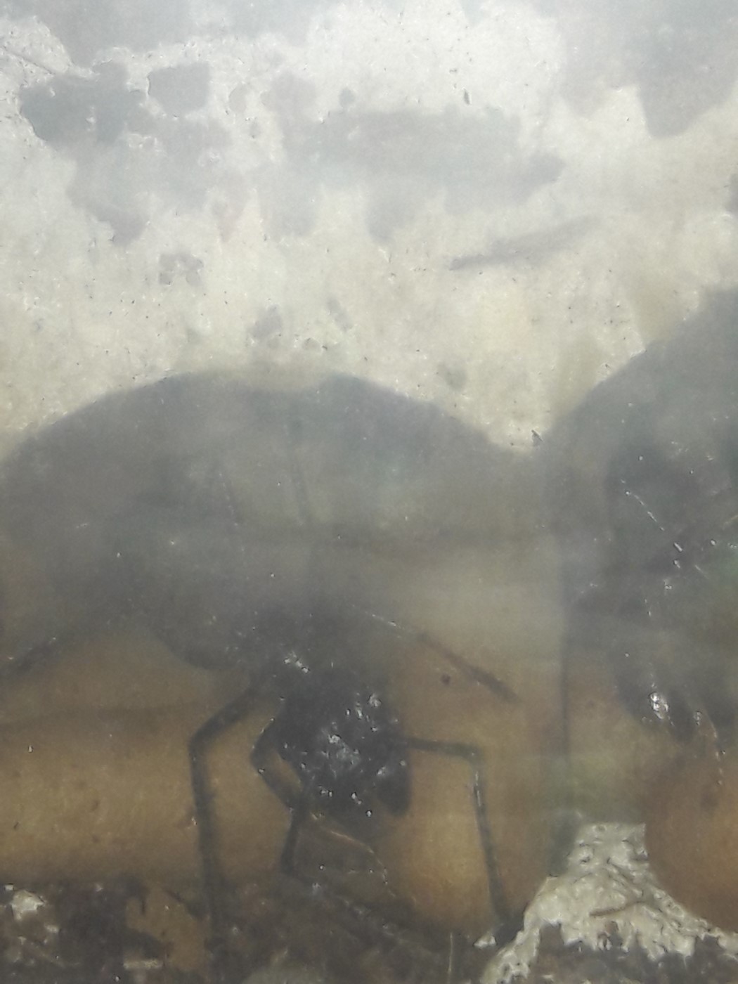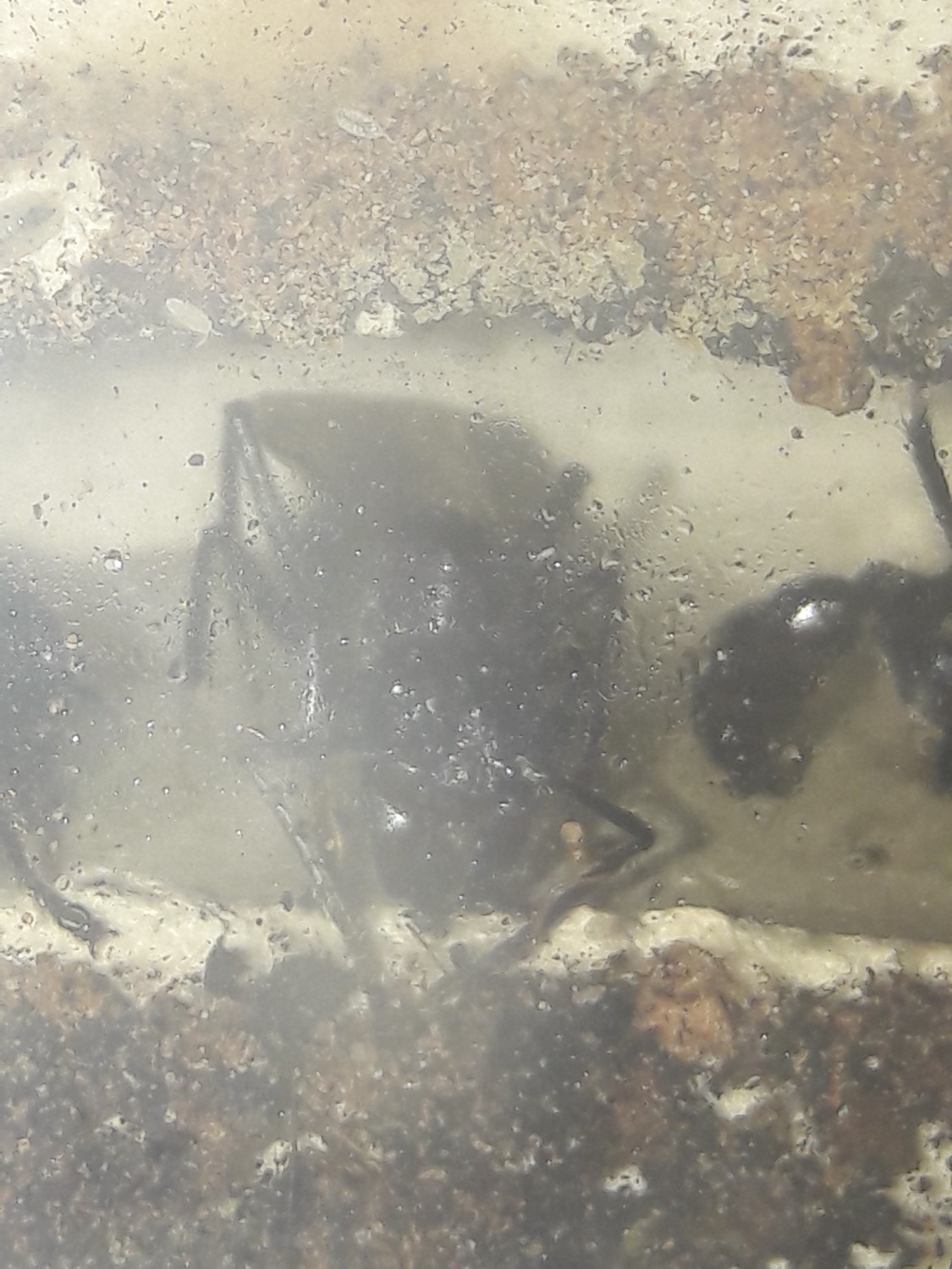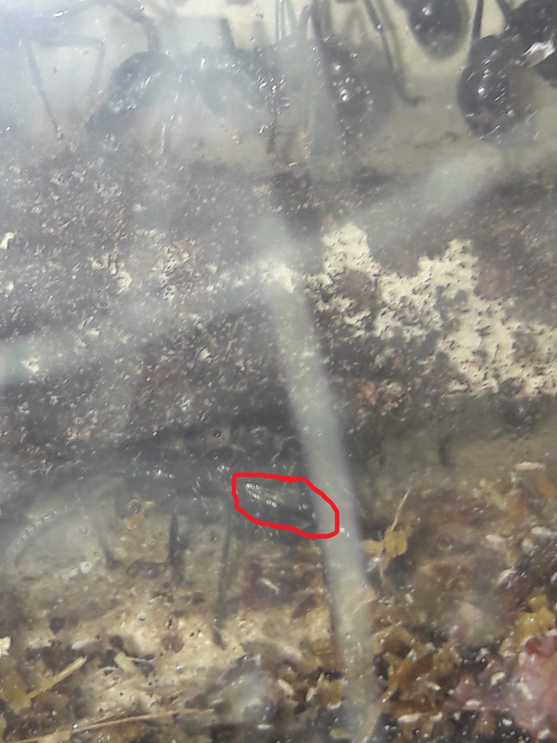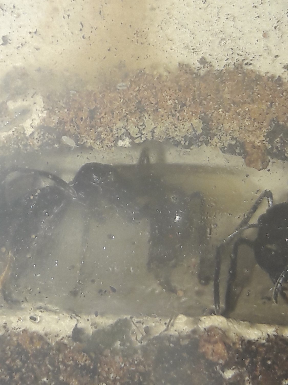. Das Formicarium ist ein 60 l Aquarium. Ein Ytong Nest, mit zwei Etagen, erstreckt sich im Frontbereich über die ganze Sichtfläche. Laut Vorbesitzer hat sie auch darin vor etwa 2 Jahren gegründet. Der Vorteil einer solchen großen Gründungsbox sind klar, Parameter wie Temperatur und Luftfeuchtigkeit lassen sich einfacher an einem bestimmten Ort konstant halten und die Gyne hat die Möglichkeit bei Ungünstigen Werten auszuweichen bzw. sich in dem von ihr gewählten optimalen Bereich aufzuhalten. Die Nesttemperatur lag nie höher als 25 °. Die Gyne startete einst mit zwei Larven bei dem Vorbesitzer. Sein Konzept war erfolgreich, ich habe es kopiert und dieses Formicarium nachgebaut.Gyne 4 kommt nicht zur Ruhe, das Erdnest und das RG werden nicht angenommen. Mehrmals täglich schiele ich in die Box, sie bemerkt mich nicht und das stresst auch nicht, doch hält sie sich immer in der Arena auf oder hängt an der Gaze des Deckels. Man muss kein Genie sein, sie will raus. Dieser Umstand ist Dauerstress und führt unweigerlich zum Tod. Sie bleibt ein Pflegefall.