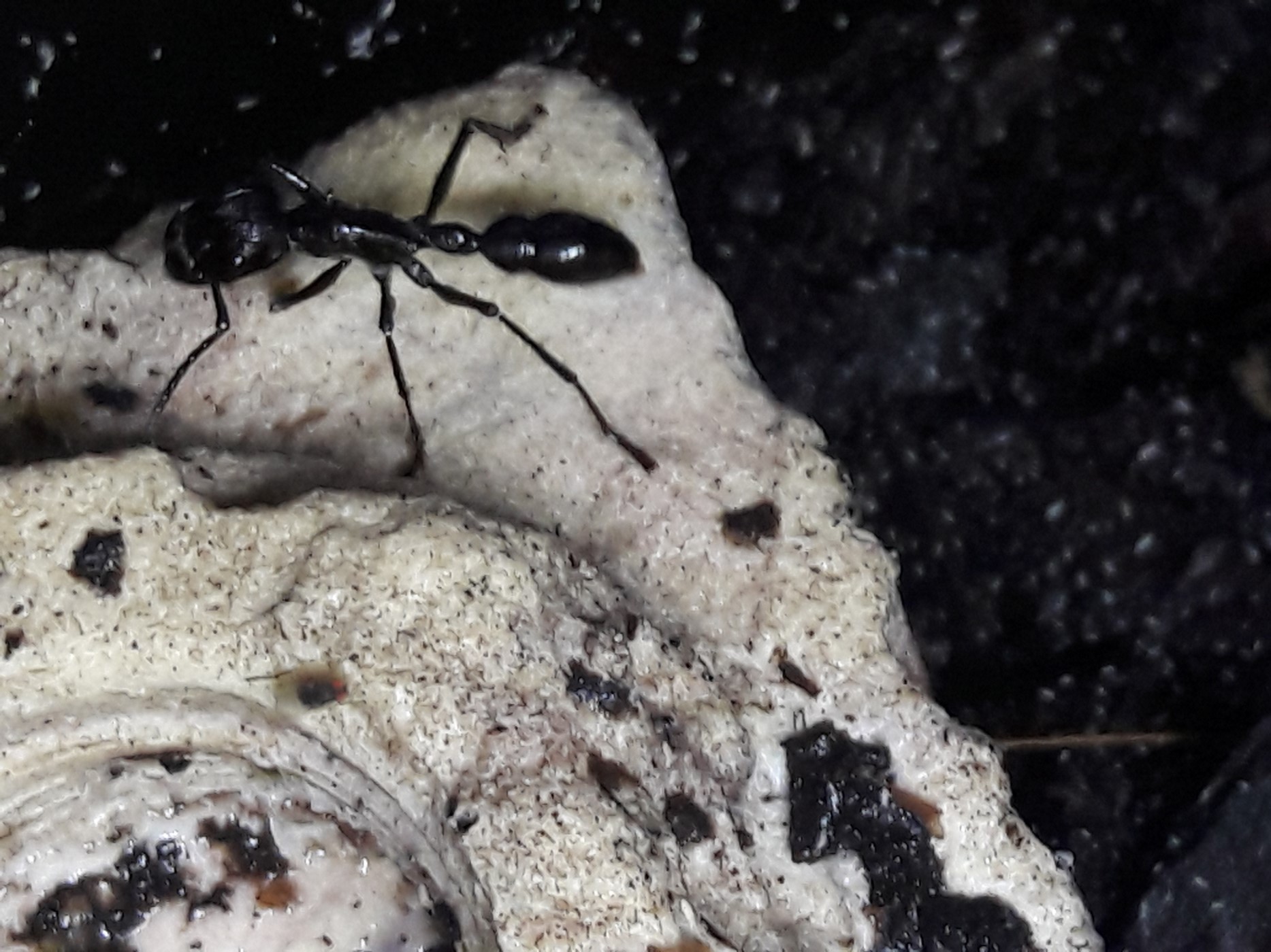 Nun auch Gyne 4?, das Territorium ist von den Anderen noch nicht vereinnahmt. Die Verteidigung sollte auch noch nicht stehen, bei Hunden funktioniert es, aber bei Clavata? Blick in die Gründungsbox der Gyne 4. Sie klebt am Deckel, übermüdet von der Nachtschicht, eine tolle neue Kolonie im Besitz. Machen einen risikofreudiger, also rein damit.