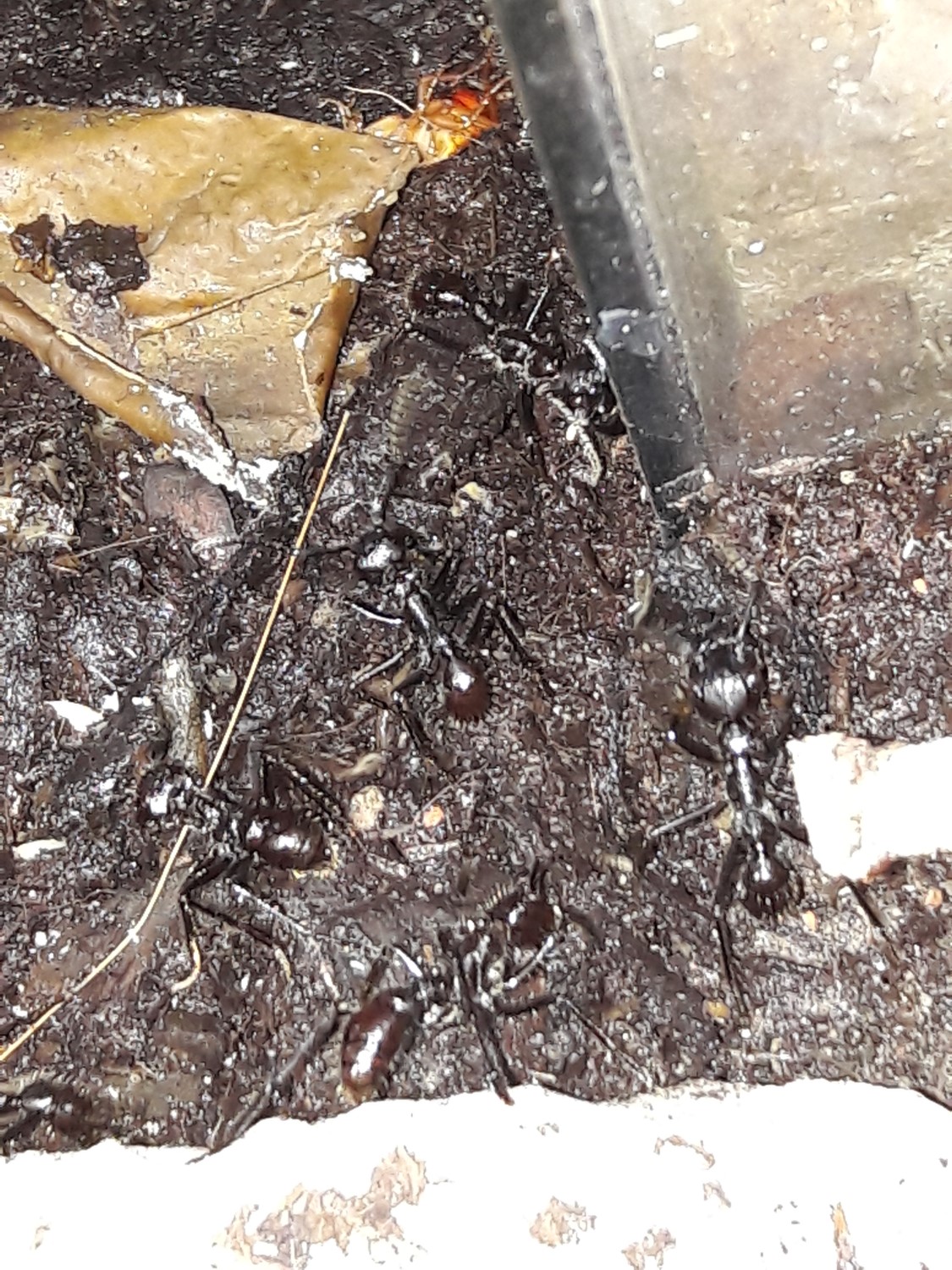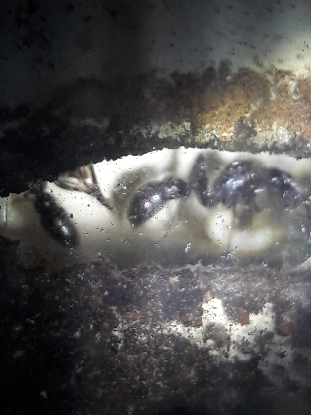 Mit den drei Gynen sieht es leider genauso aus. Sie schaffen es nicht. Es verdichtet sich immer mehr der Verdacht, unter ihnen befindet sich eine konkurrierende Gyne die die Brut frisst. Es gibt keine. Durch ein Missgeschick habe ich die Brutbox auf die Seite gelegt, zu viele Kabel in der man sich verfangen kann. Die Panik war groß zu mindestens bei mir, sie waren erstaunlich ruhig und versammelten sich in einer Ecke und warteten ab. Ich untersuchte das Nest nach Brut, mal wieder nichts.