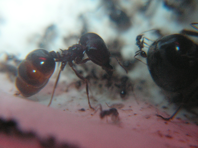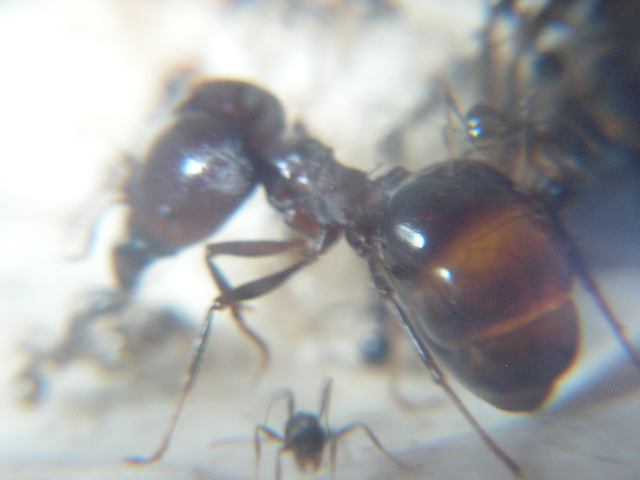 The colony are still taking food and last night took 9 fruit flys , most workers gasters are now extended and a few of the minor soldiers gasters are too. The Major soldier that was there from the beginning is still ok and her gastor is greatly extended too. :D