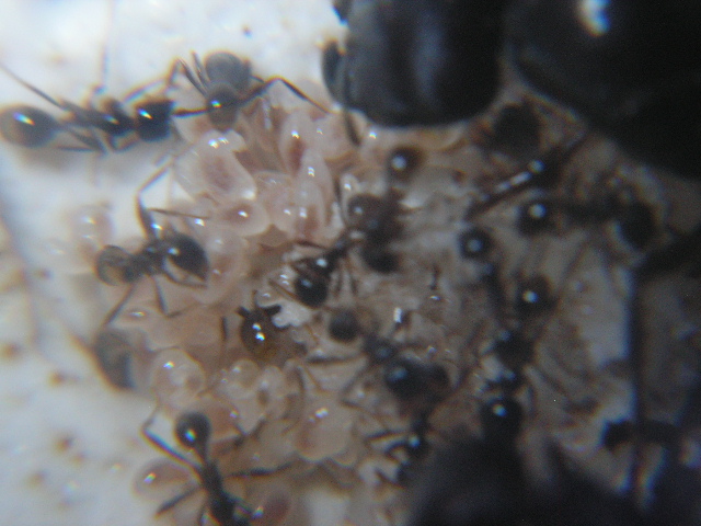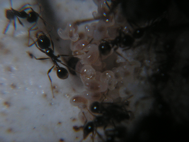 Also one thing i have noticed. The queen lays alot of eggs , i have watched her on several accasions and its amazing to see that when doing so she does not lay one egg but a small mass of them at once come out before the workers quickly find them and carry them off to the egg pile 8)