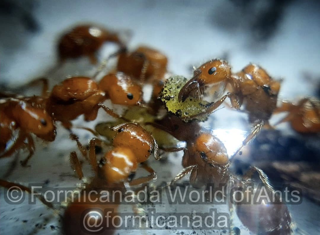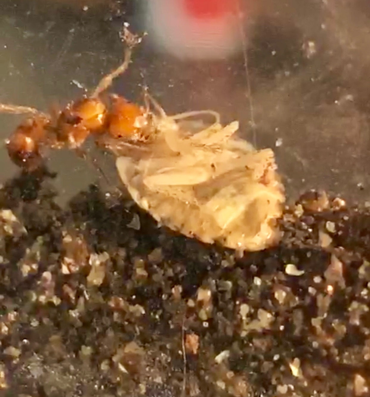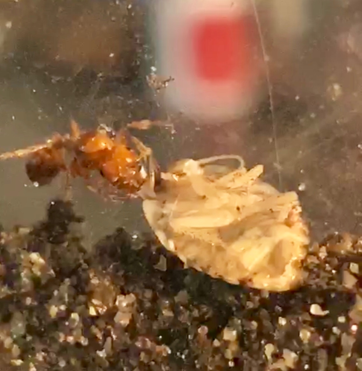 After much research it seemed Queens do not do well in the test tube set up, however I decided to at least try in the one she arrived in.... well she had already tried digging into the cotton wool at the water reservoir side, and I mean she really really had dug into it, I assumed it was ‘journey to my door’ stress and gave her a few days to settle, but she did not, she was relentless and determined to get through that cotton wool, but of it where beginning to stray off, so I made the decision to try her in an original ant farm set up, after moving in she immediately began a burrow, she only dug about 2cms n then she gave up, and spent the next few days constantly tooing and froing along the soil surface, to the water test tube and digging at the cotton wool again... I was puzzled, so I went back to my researched book marks, and found the guy who had experimented with queens in test tubes and round soil filled tubs.... the queens in the soiled filled tubs thrived much more than the ones in test tubes, so I set her one up, gave her access and she has spent the last 24hours excavating what I assume to be her founding chamber, because these queens are semi claustral, I have offered her a sterilised dead roach to help regain the energy I’m sure she lost trying to get out of the test tube, she spent almost an hour gauging on it.