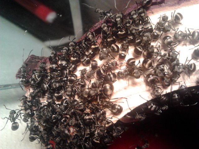 WoW! Heute ist viel passiert! Ich dachte ja schon, dass das Eierpaket nicht überlebt hat, aber heute sah ich eine Ameise, die es trug! Außerdem sah ich eine Arbeiterin, die eine Larve fütterte! Leider habe ich nur eine Larve gesehen, also kann ich nicht sagen, ob noch mehr Larven da sind! Außerdem haben sie an der Seite des Nestes alles voller Humus zu gemacht (minimaler Zwischenraum zwischen Nest und Glas). Ich denke damit sie die Luftfeuchtigkeit besser regulieren können. Das Verbindungsrohr wird auch schon gut genutzt, und es sind fast immer 5-7 Ameisen in dem 2. Becken ! Der Humus Boden ist auch schon gut getrocknet, nur unten ist er noch feucht. Das merkt man auch an der Luftfeuchtigkeit, denn die ist von ca.90% auf 60% gesunken. Hoffentlich