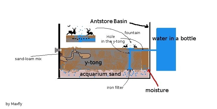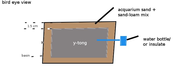 Drill the Y-tong in a T-tunnel, fill the T-tunnel with acquarium sand, fix the iron fence to the top for the fountain and to the bottom for moisture source.