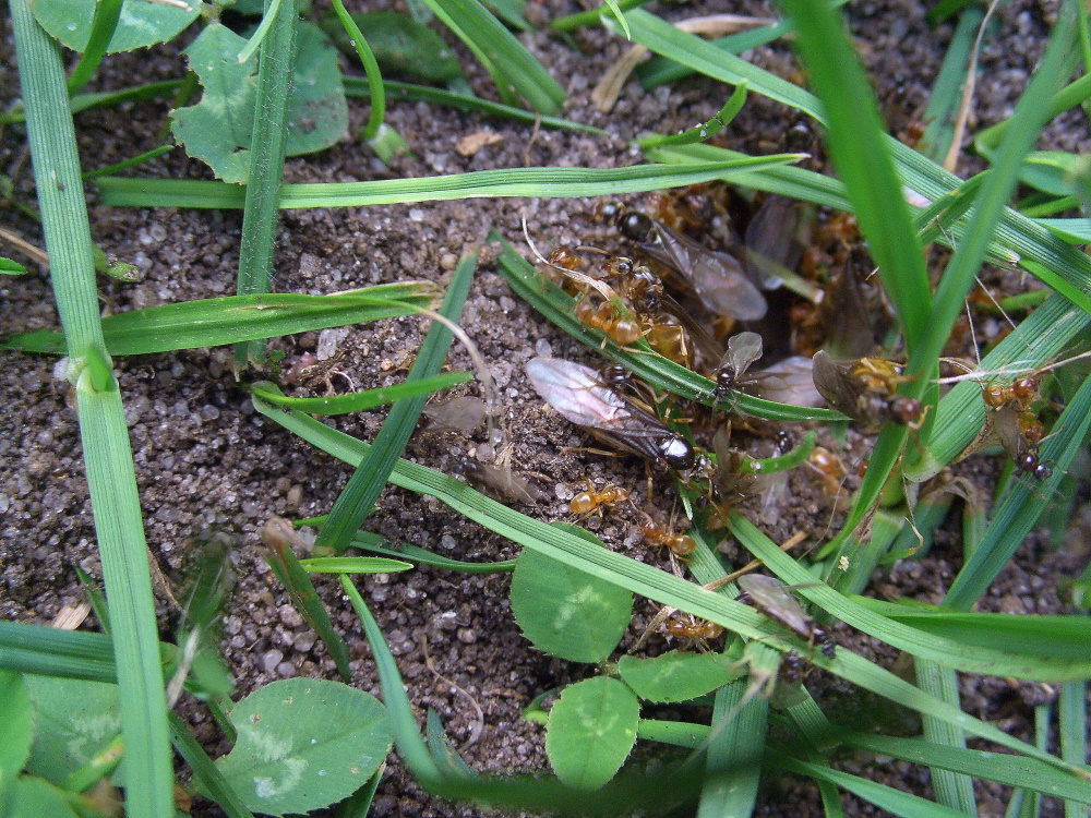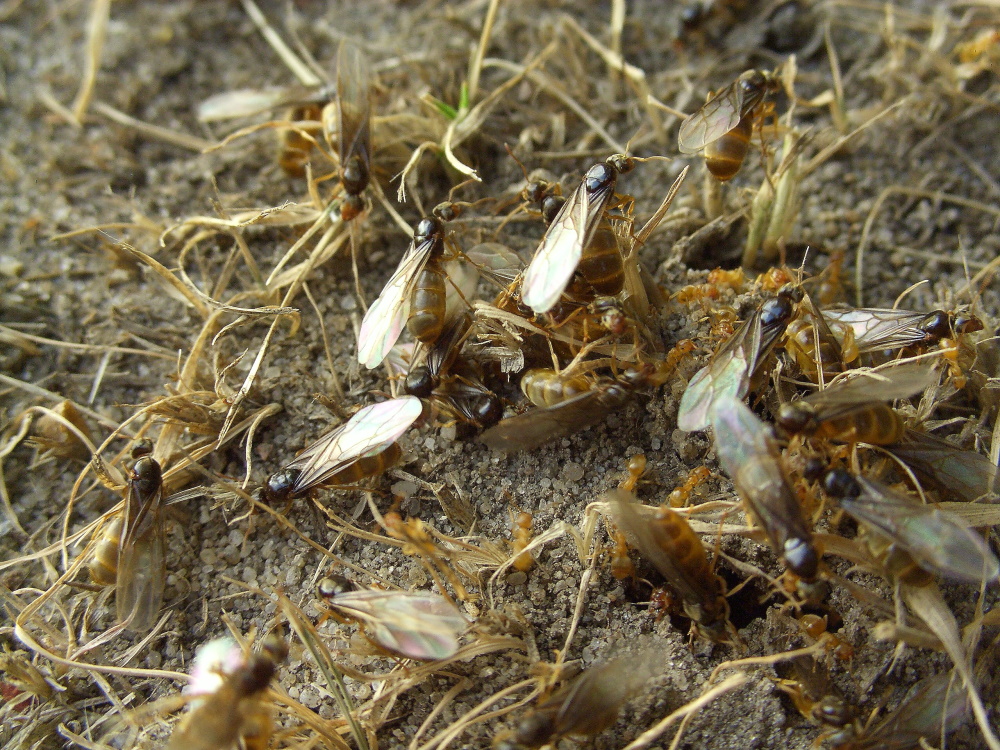 Am späteren Nachmittag dann Aktion, die Geschlechtstiere quillen förmlich aus den Nestern, binnen weniger Minuten wimmelt es nur so von ihnen, dazwischen aufgeregt eine große Schar von Arbeiterinnen.