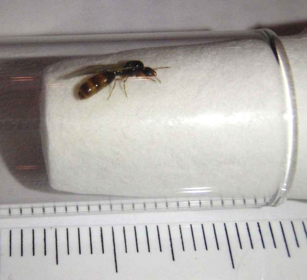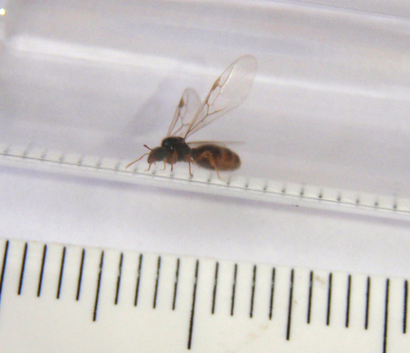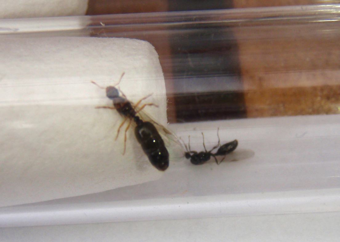 Die Könniginnen (wenn es welche sind) sind ca 6-7 mm lang sie sind dunkel (fast schwarz) mache haben einen rötlich schimmerden Gaster. Eine Fliegende Ameise war etwas kleiner (siehe Foto) ich schätze es ist ein Männchen.