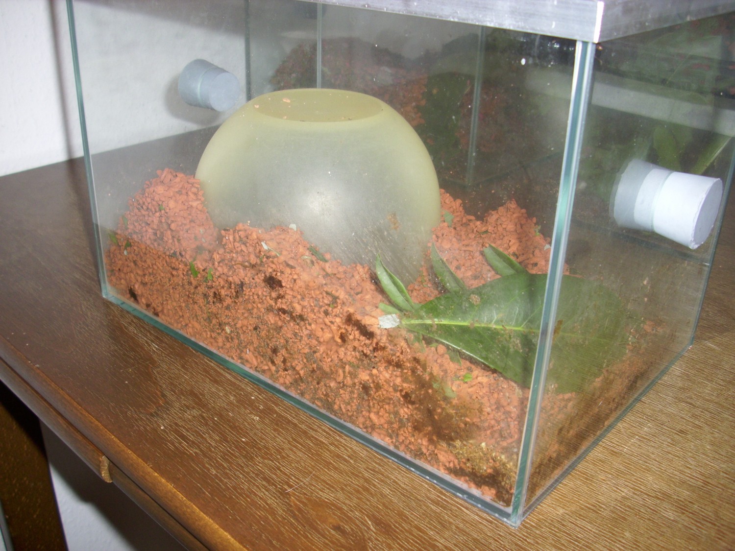 Ja bei meinen Attas geht es langsam wieder Berg auf, so scheint es zumindest :). Sie schneiden wieder und bringen regelmäßig Blattstücke unter die Kuppel. Ich habe aber im Gegensatz zwei Müllhaufen entdeckt, sie sind nicht sehr groß, aber es lässt mich doch vermuten, dass der Umzug nicht so Prickelnd für die Ameisen war. Na ja, ich hoffe meine Acros erholen sich auch wieder relativ schnell, denn so ein Umzug ist doch eine sehr, sehr große Belastung für eine Kolonie, das sollte man immer im Hinterkopf behalten und geht auch häufig schief :(. Na ja nicht Trübsal blasen, hier einige Bilder :).