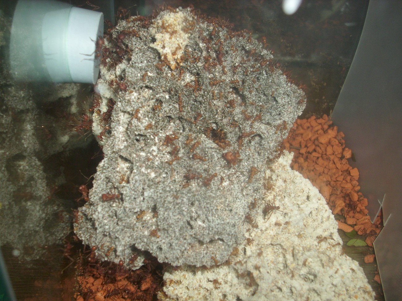 Gestern war der große Umzug in die neue Behausung. Sie haben jetzt angefangen jeden kleinen schlitz zu schließen und machen kleine Eingänge. Schneiden tun sie gerade nicht, denn sie sind viel zu sehr damit beschäftigt alles zu Regulieren was für die Kolonie wichtig ist. Diese Erfahrung habe ich schon oft gemacht. Bei Acromyrmex z.B hatte ich totale Angst, warum sie nicht mehr schneiden aber nach 2 oder 3 tagen fängt es langsam wieder an, also keine Panik. Die Bedingungen für eine gute Kultivierung des Pilzes habe ich geschaffen sie sind´, wie ihr sicher schon gesehen habt, nun unter einer Kuppel ( Tupperbox. In dieser Tupperbox kann sich jetzt wieder schon Luftfeuchtigkeit sammeln. Aber nun einige Bilder :)